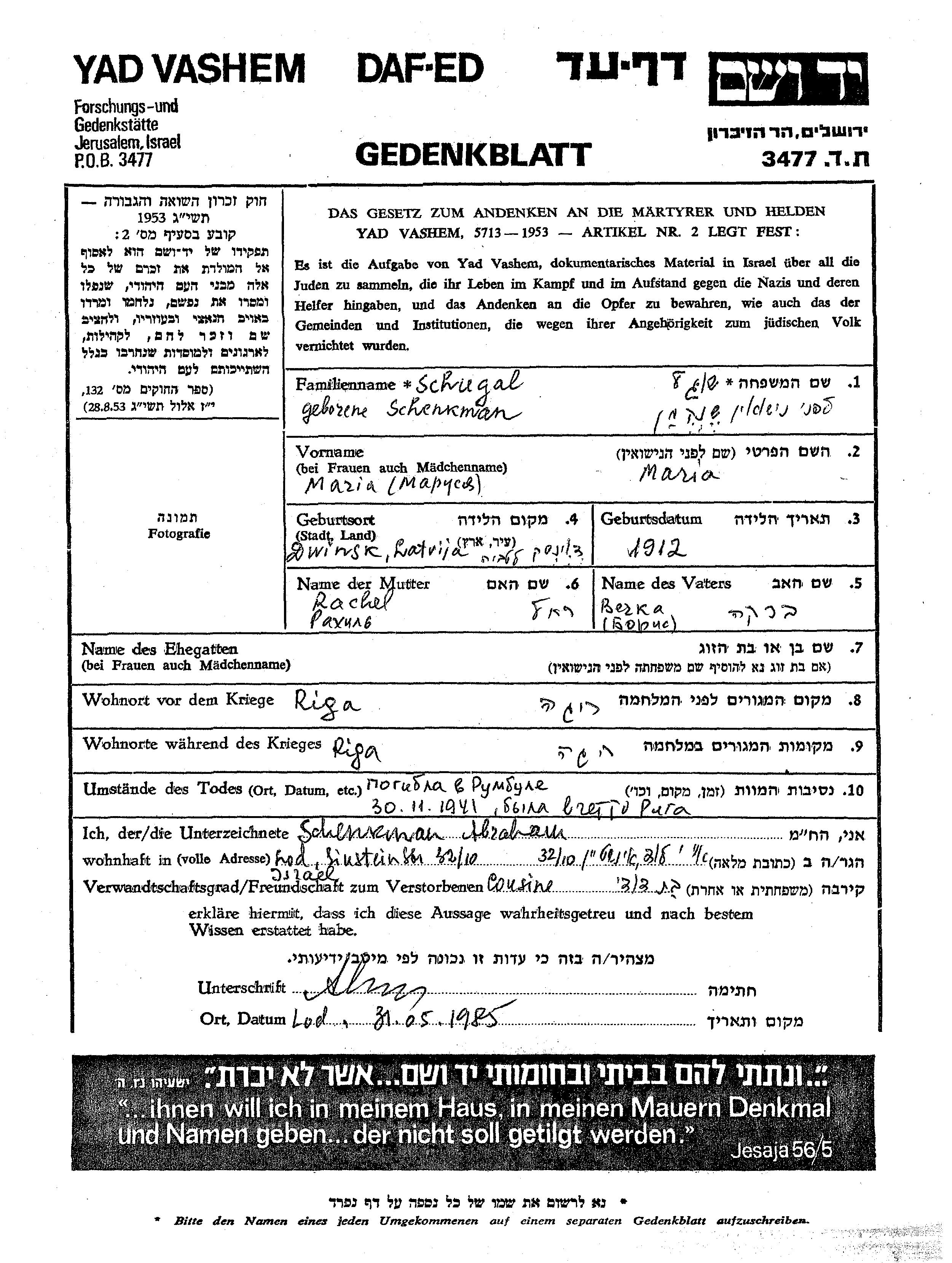 Maria Schugal, geb. Schenkman wurde im Jahr 1912 in Dwinsk, Lettland geboren. Sie war die Tochter von Berka Boris und Rachel. Vor dem Zweiten Weltkrieg lebte sie in Riga, Lettland. Während des Krieges war sie in Riga, Lettland.