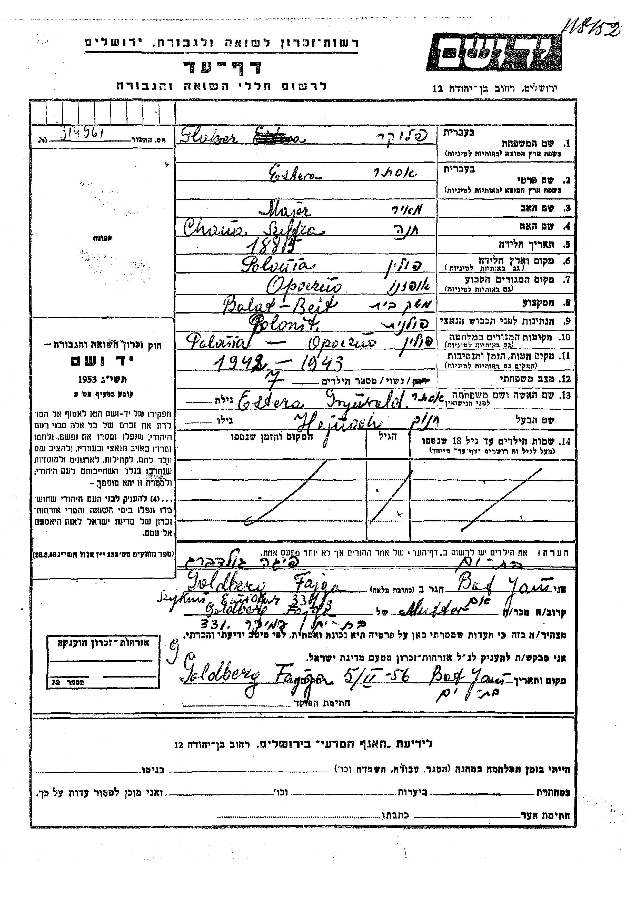 Estera Floker, geb. Grynwald wurde im Jahr 1885 in Polen geboren. Sie war die Tochter von Majer und Chana Szyfra. Sie war Haushaltshilfe und mit Hejnoch Verheiratet. Vor dem Zweiten Weltkrieg lebte sie in Opochno, Polen. Während des Krieges war sie in Opochno, Polen.