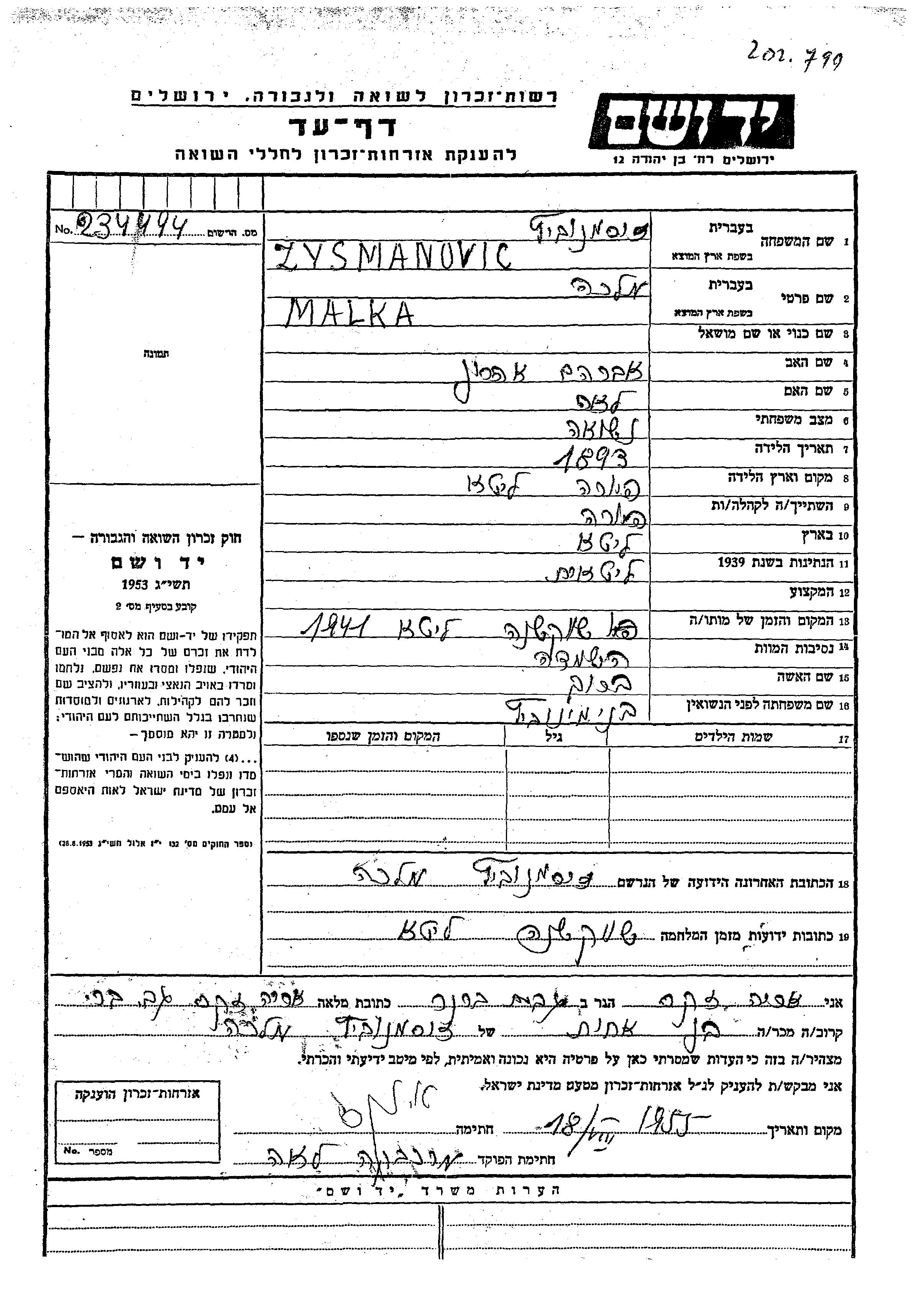 Malka Zysmanovic, geb. Beniaminovitz wurde im Jahr 1893 in Piora, Litauen geboren. Sie war die Tochter von Avraham Aharon und Lea. Sie war mit Barukh Verheiratet. Vor dem Zweiten Weltkrieg lebte sie in Piora, Litauen. Während des Krieges war sie in Szweksne, Litauen.