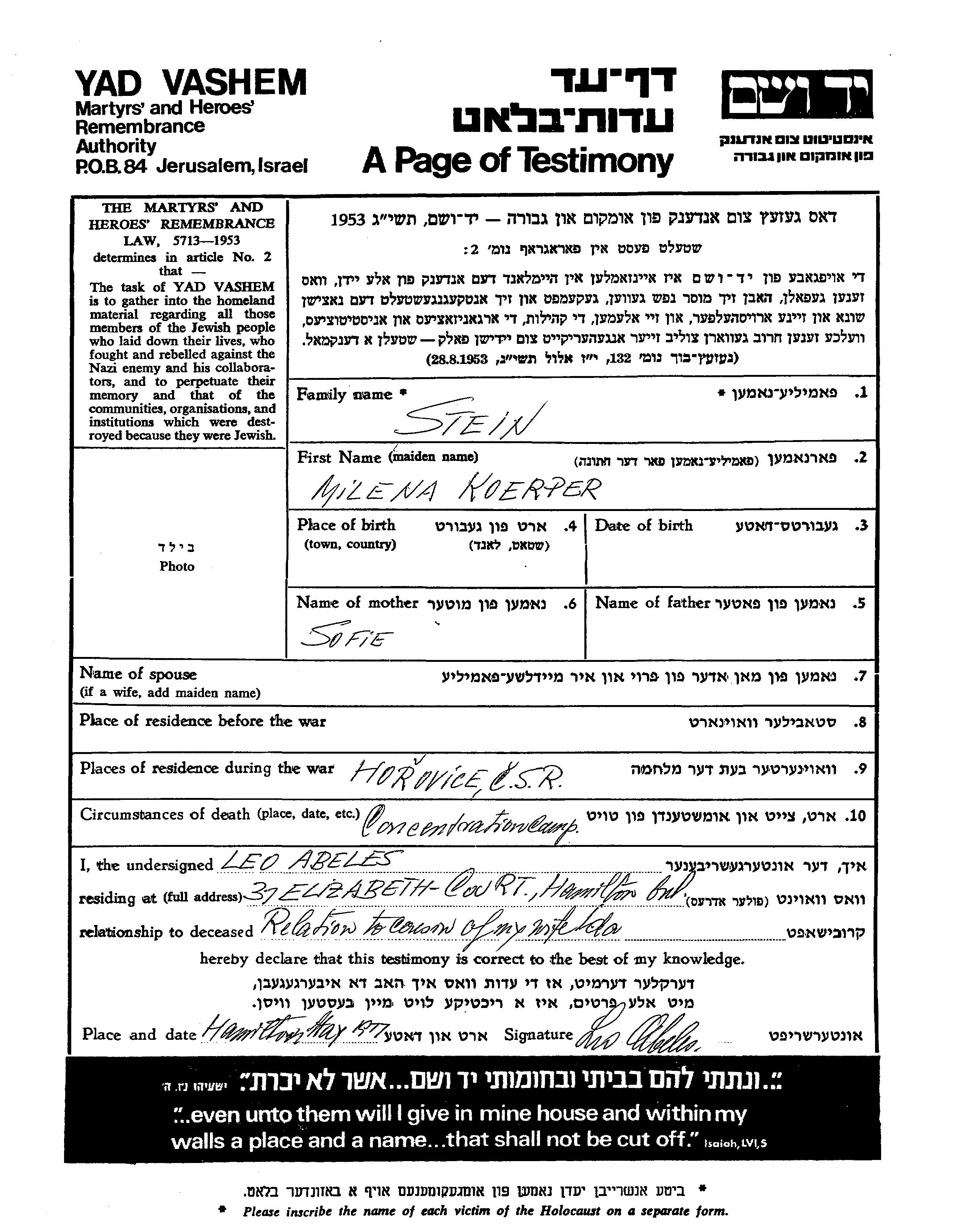 Milena Stein, geb. Koerper wurde Sie war die Tochter von Sofie. Während des Krieges war sie in Horovice, Tschechoslowakei.