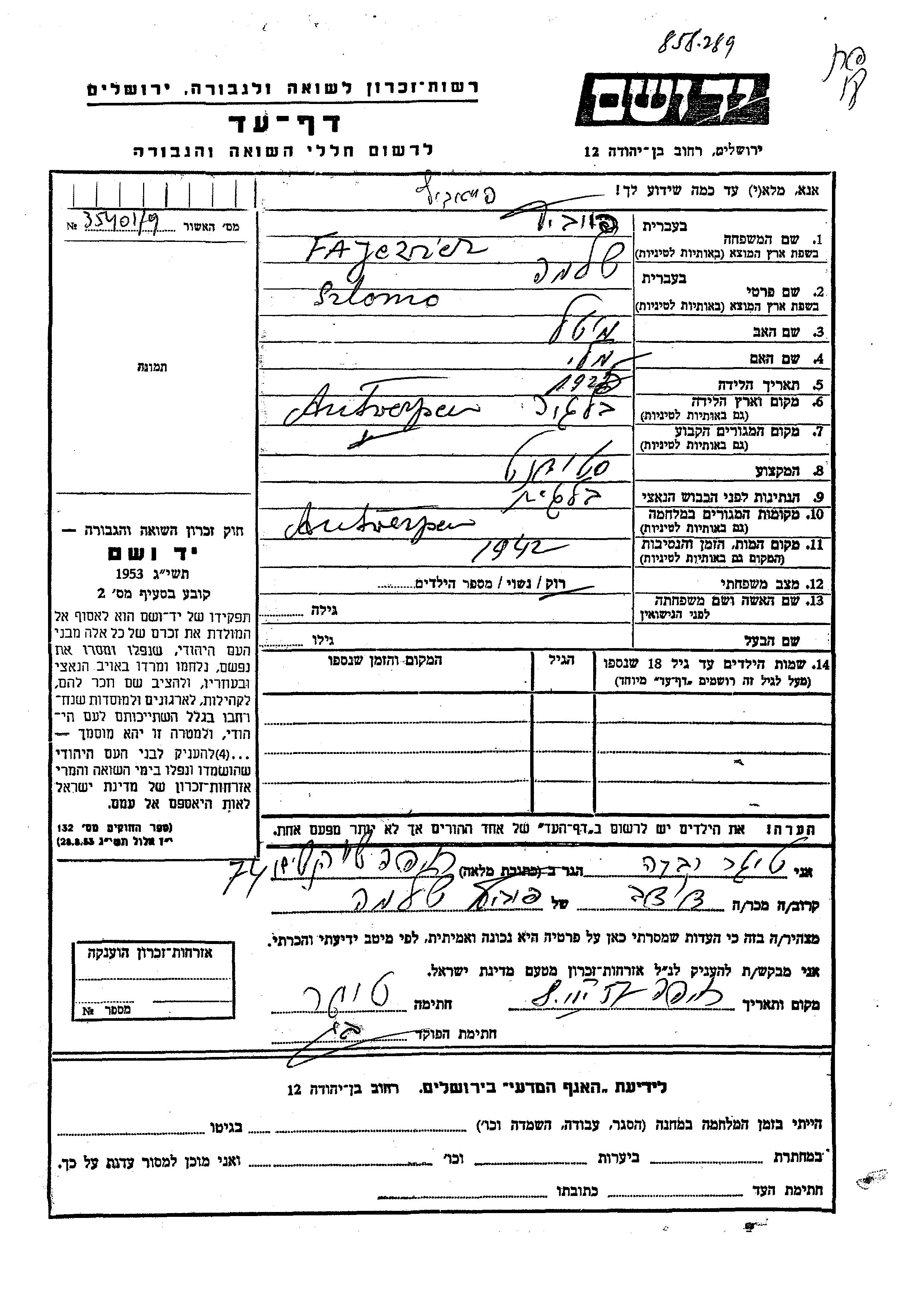 Fajewicz Szlomo 1925 Antwerpen, Belgien Gedenkblatt