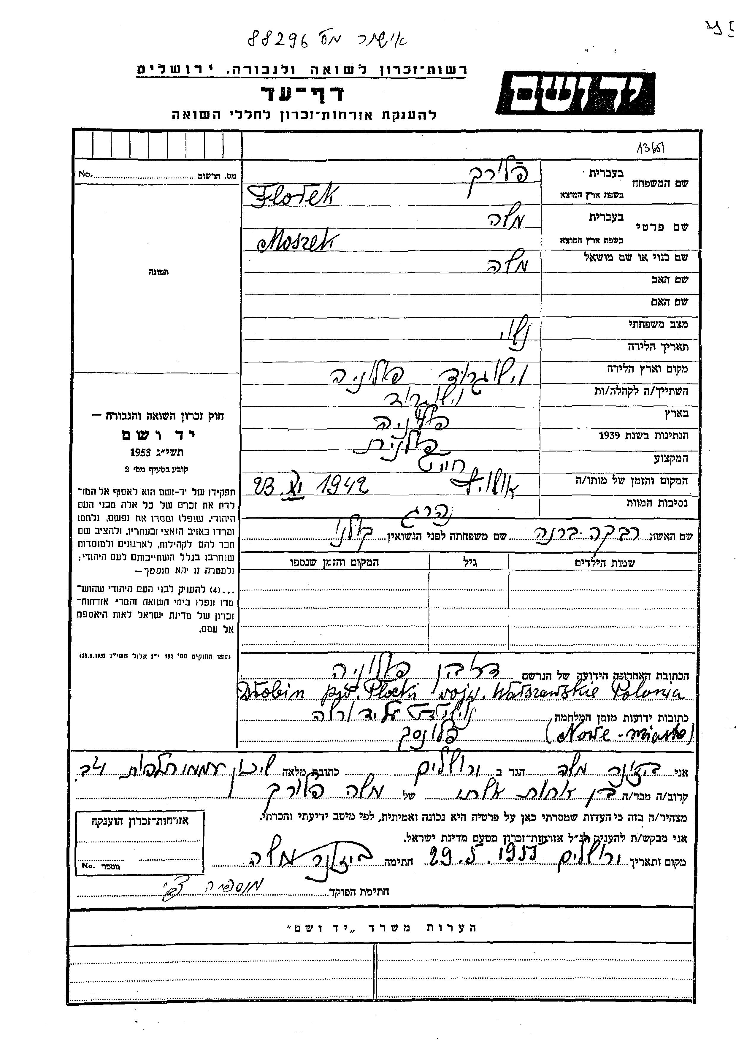 Moszek Florek wurde in Wyszogrod, Polen geboren. Er war Schneider. Vor dem Zweiten Weltkrieg lebte er in Wyszogrod, Polen. Während des Krieges war er in Drobin, Polen.