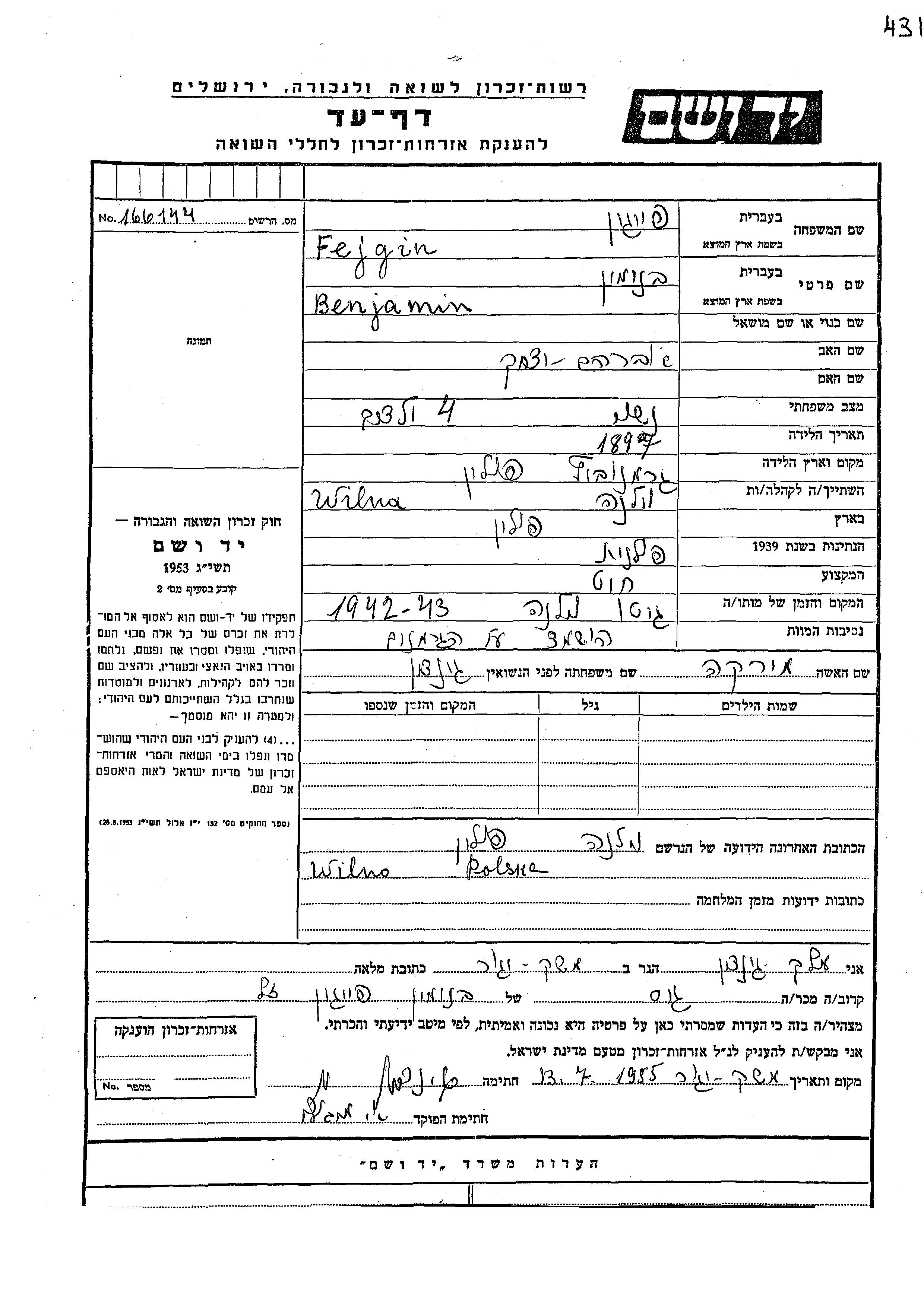 Benjamin Fejgin wurde im Jahr 1897 in Germanavichy, Polen geboren. Er war der Sohn von Avraham Yitzkhak. Er war Schneider und mit Mirka, geb. Gindin Verheiratet. Vor dem Zweiten Weltkrieg lebte er in Wilno, Polen.