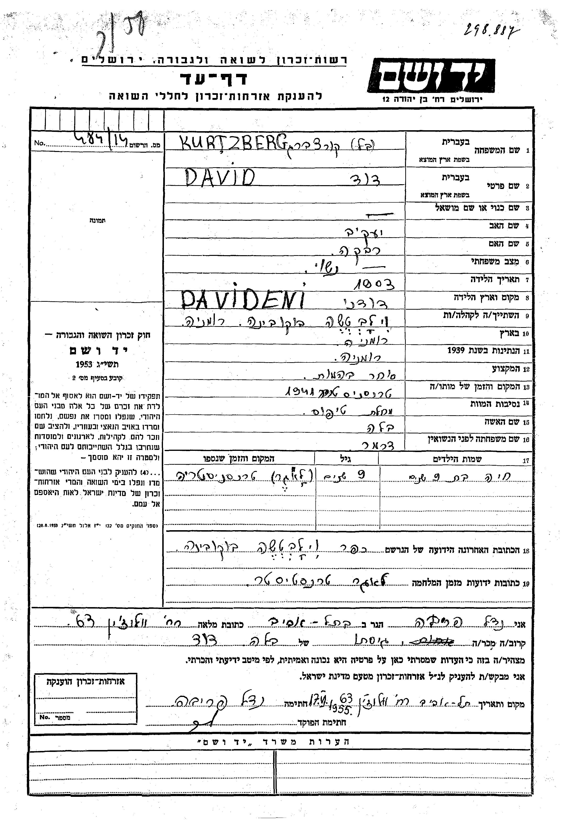 David Kurtzberg wurde im Jahr 1903 in Davideni, Rumänien geboren. Er war der Sohn von Yaakov und Rivka. Er war Viehhändler und mit Bela, geb. Dermer Verheiratet. Vor dem Zweiten Weltkrieg lebte er in Vilavcea, Rumänien. Während des Krieges war er in Transnistria, Ukraine (UdSSR).