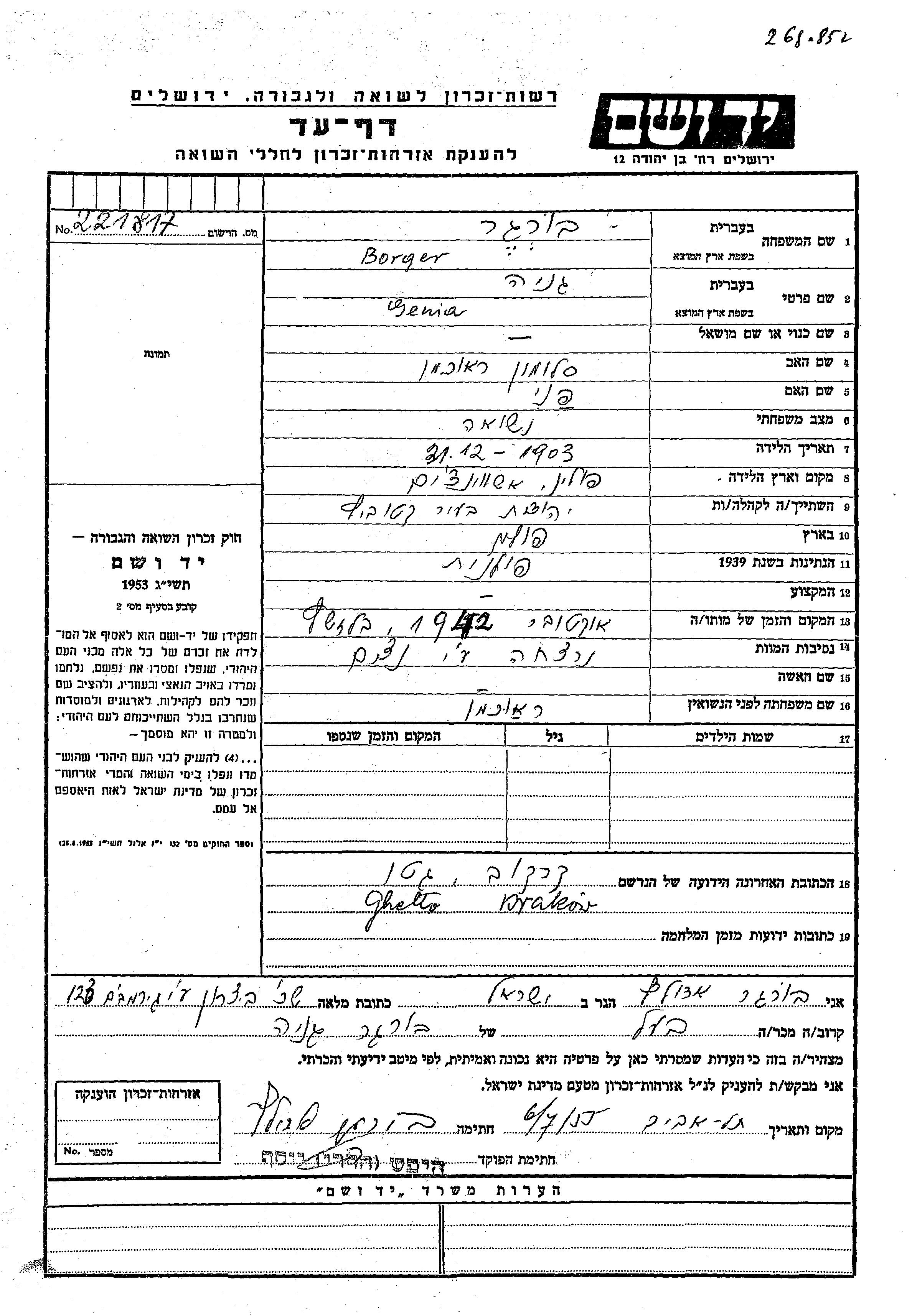 Genia wurde in der Schoah ermordet. Todesort: Belzec, Polen im Jahr 10/1942.