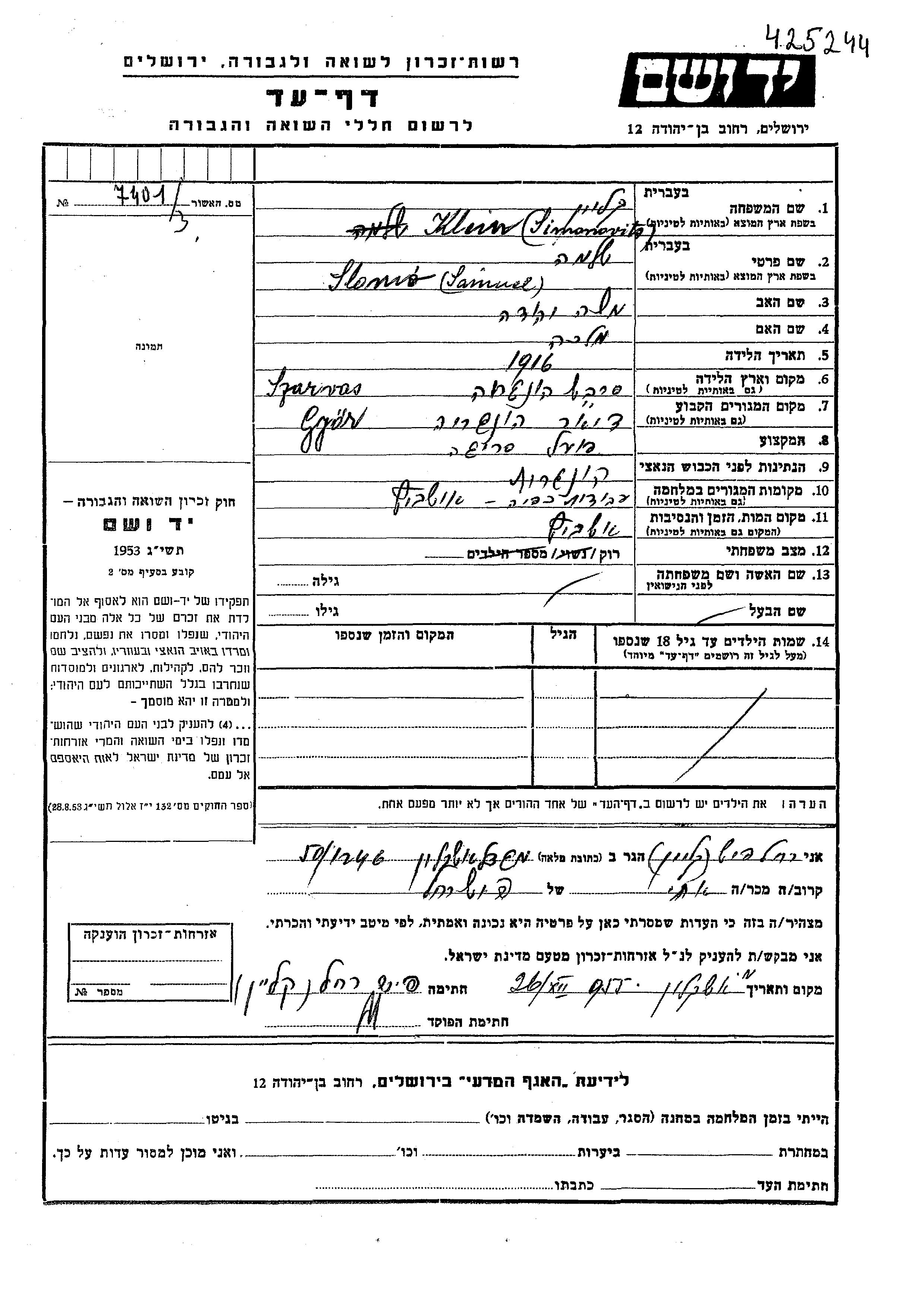 Slomo Samuel Limanovitz Klein wurde im Jahr 1916 in Szarvas, Ungarn geboren. Er war der Sohn von Moshe Yehuda und Malka. Er war Stricker/-in und Ledig. Vor dem Zweiten Weltkrieg lebte er in Gyor, Ungarn. Während des Krieges war er in Auschwitz, Polen.