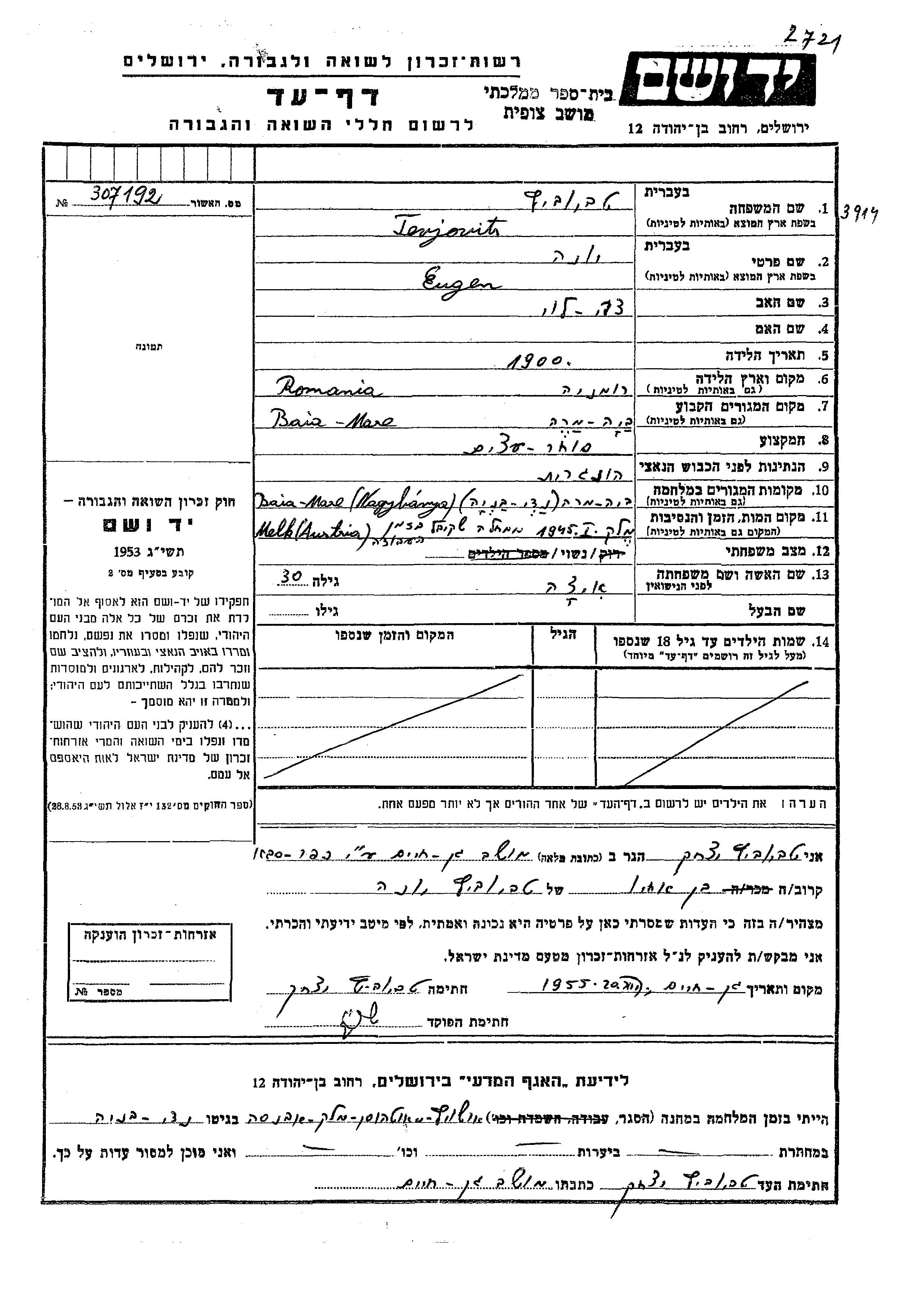 Eugen Yona Tevjovits wurde im Jahr 1900 in Rumänien geboren. Er war der Sohn von Tzvi Levi. Er war Holzhändler/-in und mit Ida Icie Verheiratet. Vor dem Zweiten Weltkrieg lebte er in Baia Mare, Rumänien. Während des Krieges war er in Baia Mare, Rumänien.