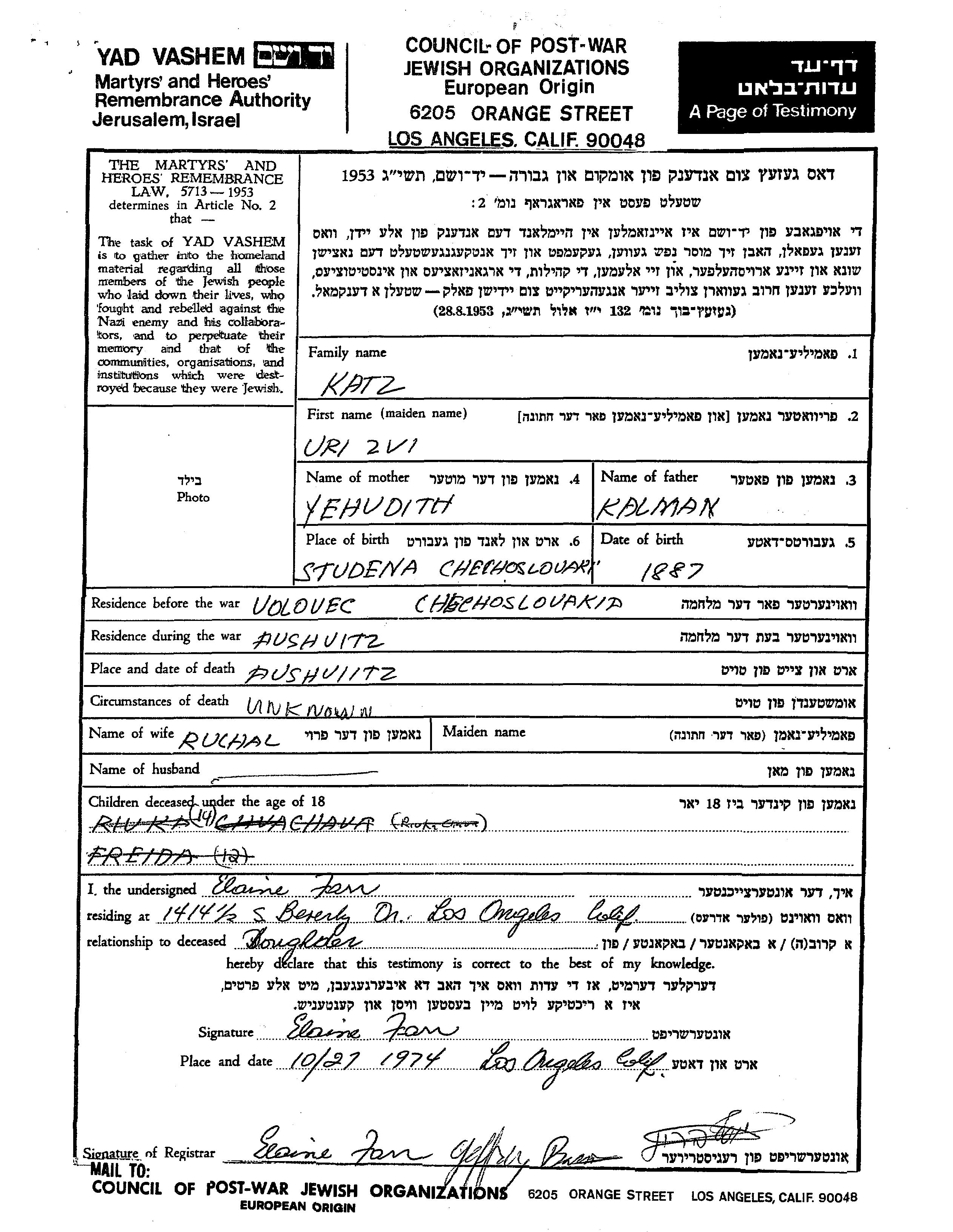Uri Zvi Katz wurde im Jahr 1887 in Studena, Tschechoslowakei geboren. Er war der Sohn von Kalman und Yehudith. Er war mit Ruchal Verheiratet. Vor dem Zweiten Weltkrieg lebte er in Volovec, Tschechoslowakei. Während des Krieges war er in Auschwitz, Polen.