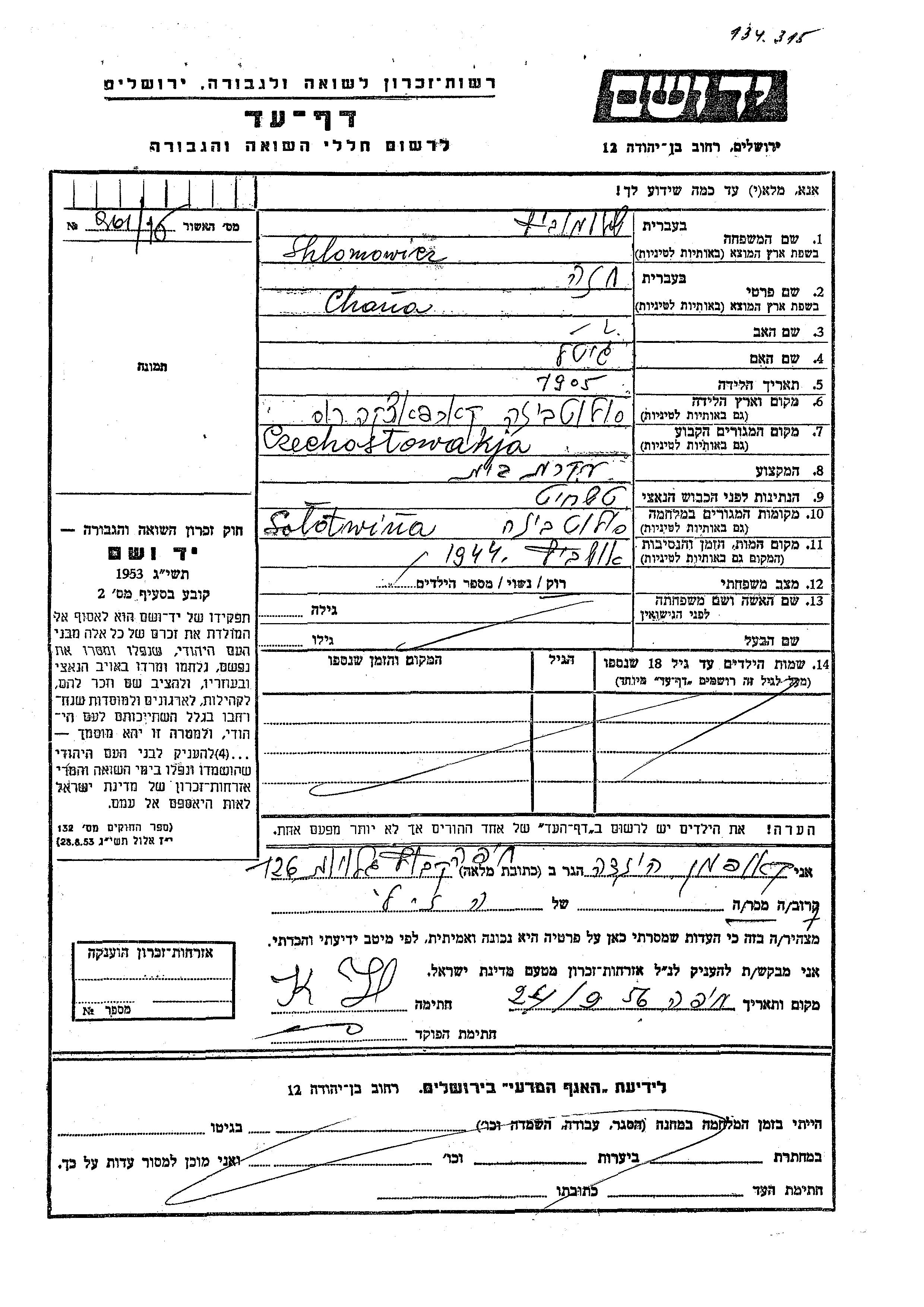 Shlomowicz Chana 1905 Tschechoslowakei Gedenkblatt