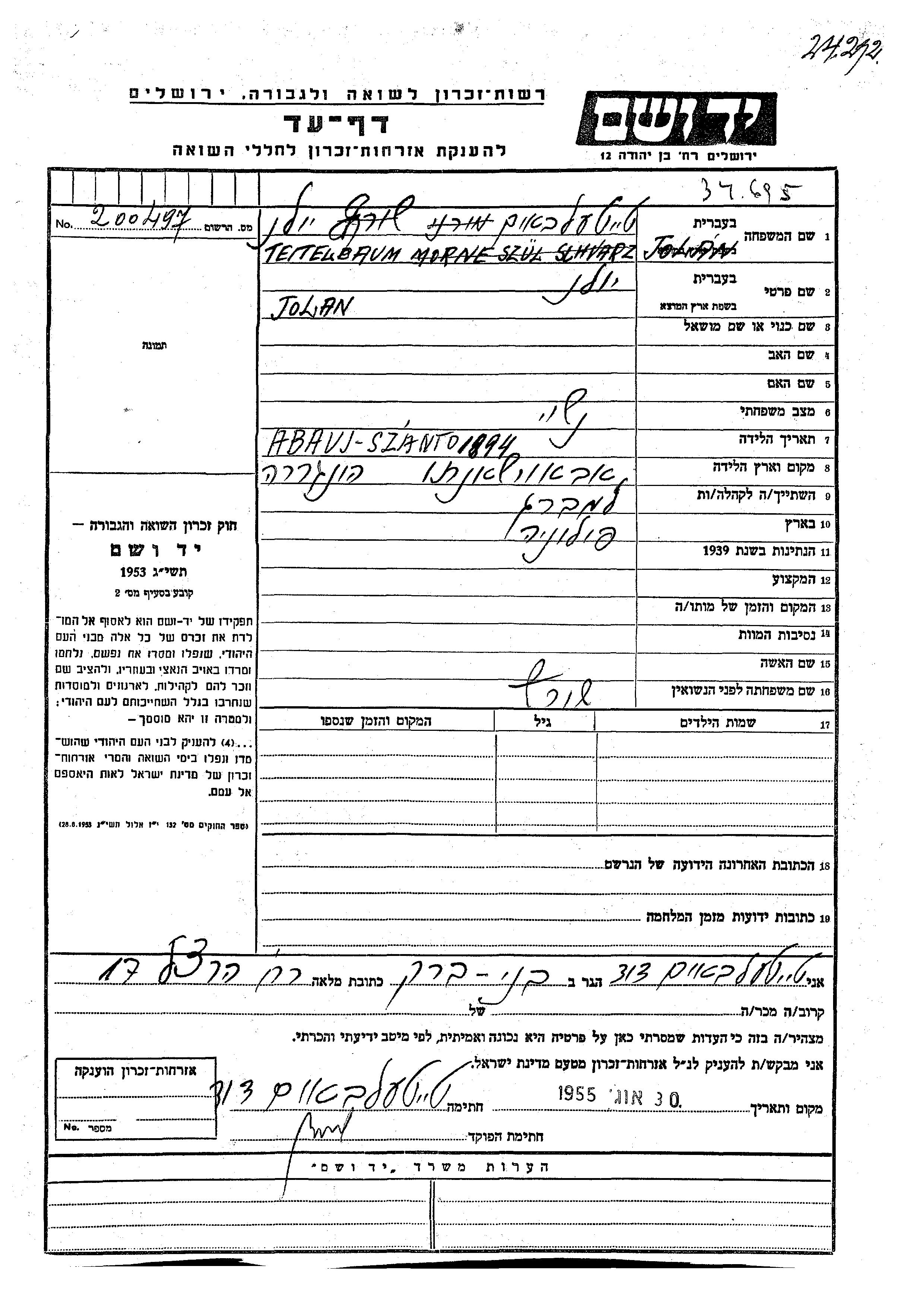 Jolan Teitelbaum, geb. Shvartz wurde im Jahr 1894 in Abaujszanto, Ungarn geboren. Vor dem Zweiten Weltkrieg lebte sie in Lemberg, Polen.