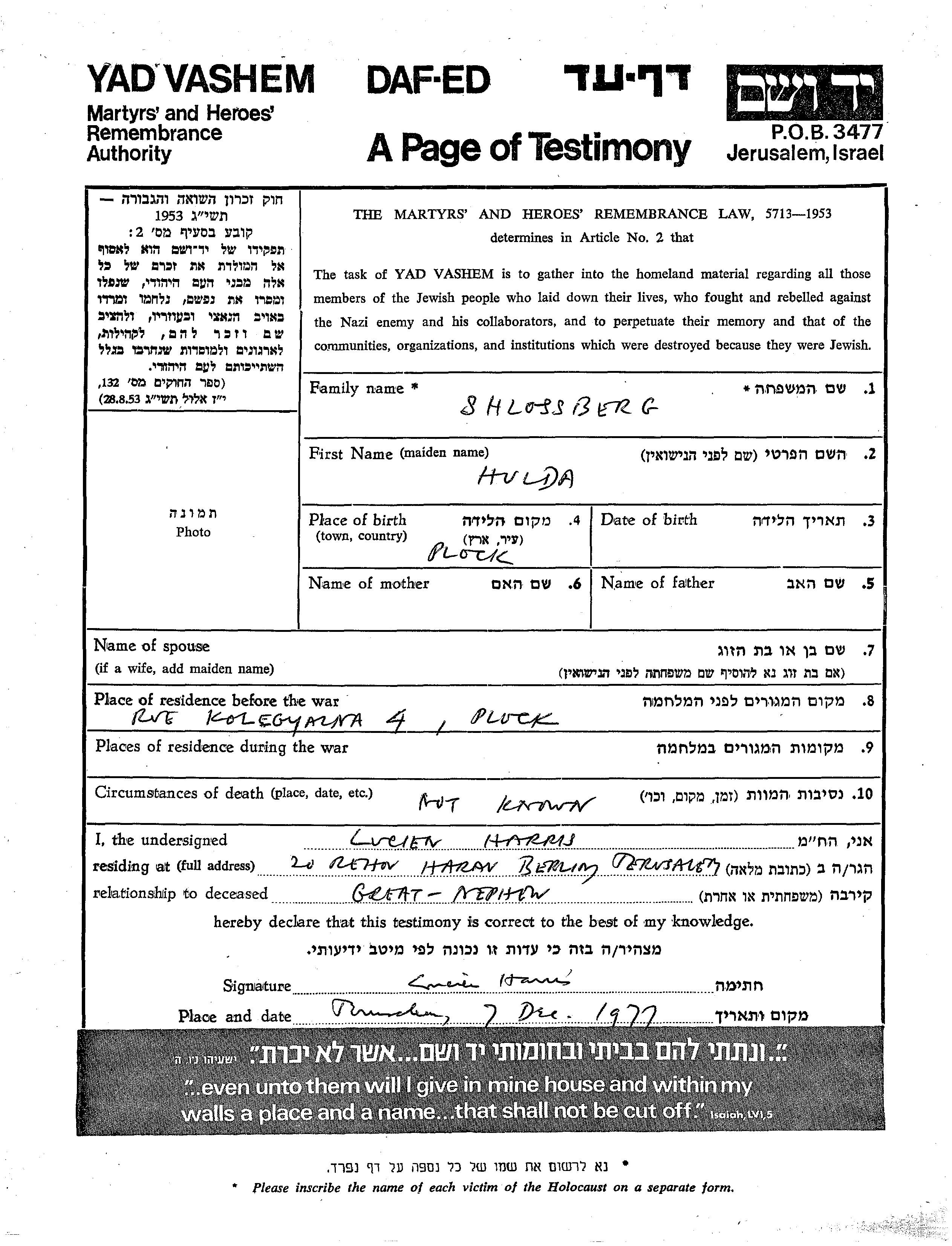 Hulda Shlossberg wurde in Plock, Polen geboren. Vor dem Zweiten Weltkrieg lebte sie in Plock, Polen.
