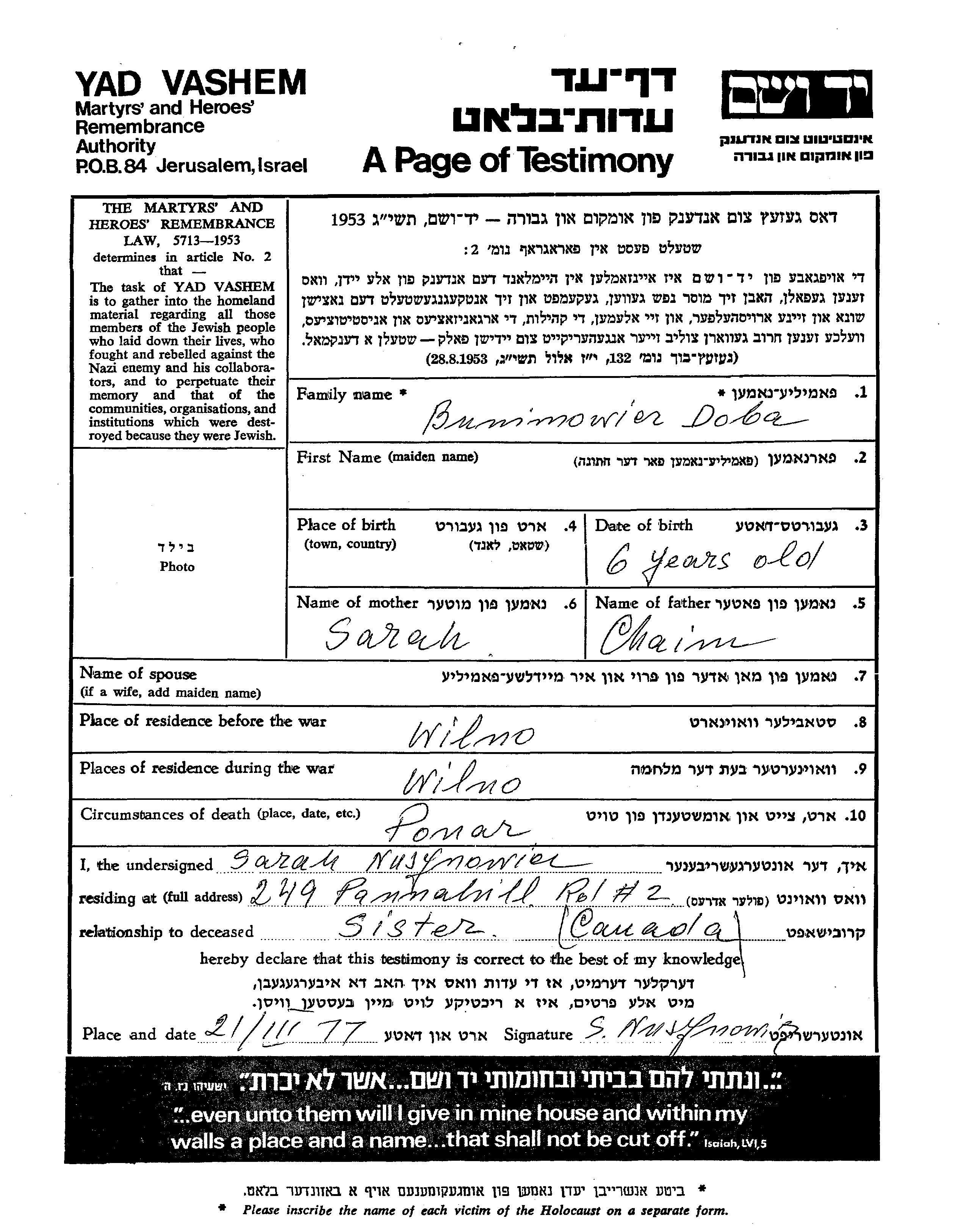 Doba Bunimowicz wurde Sie war die Tochter von Chaim und Sarah. Sie war Ledig. Vor dem Zweiten Weltkrieg lebte sie in Wilno, Polen. Während des Krieges war sie in Wilno, Polen.