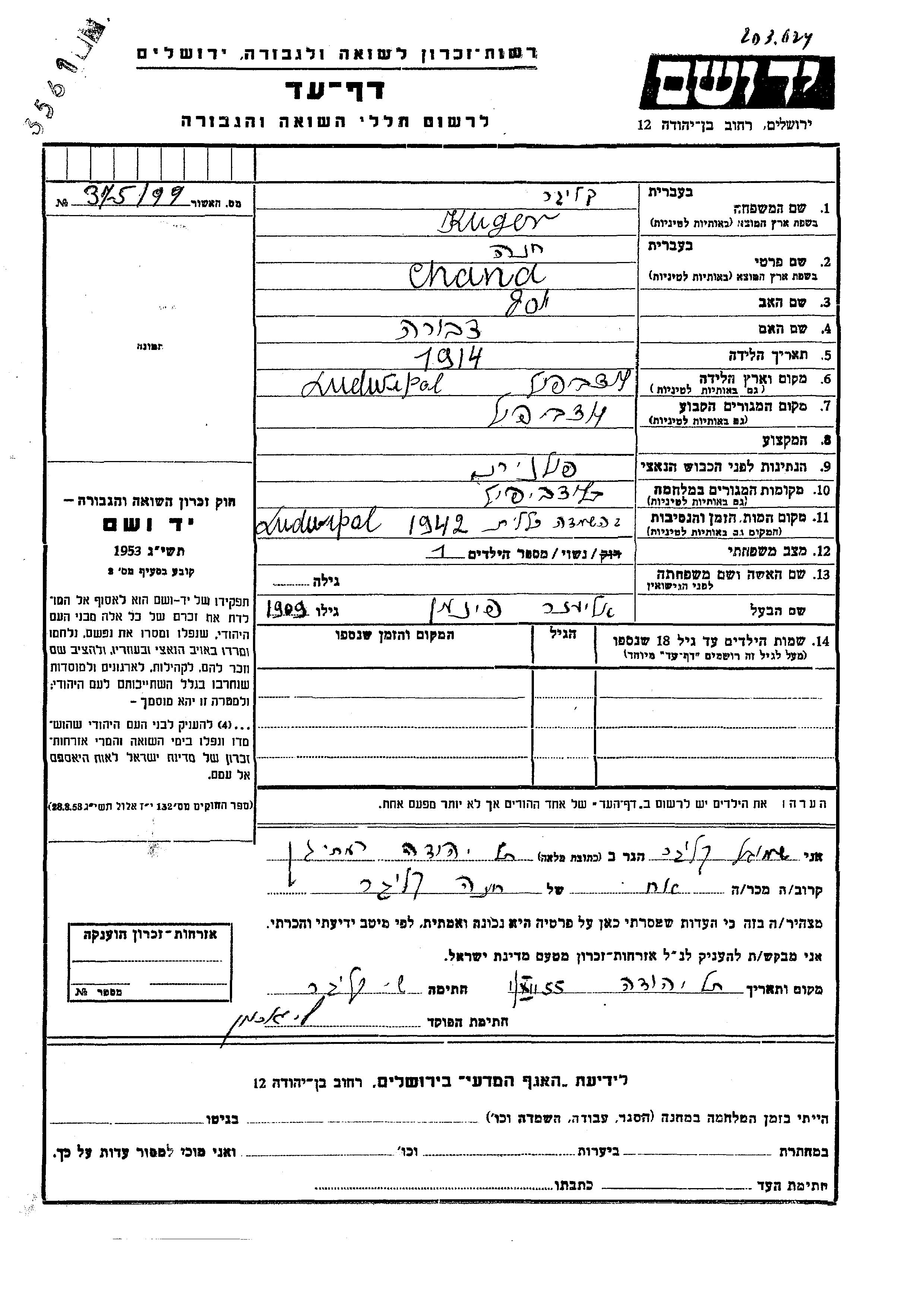 Chana Feinman, geb. Kliger wurde im Jahr 1914 in Ludwipol, Polen geboren. Sie war die Tochter von Yosef und Dvora. Sie war mit Eliezer Verheiratet. Vor dem Zweiten Weltkrieg lebte sie in Ludwipol, Polen. Während des Krieges war sie in Ludwipol, Polen.