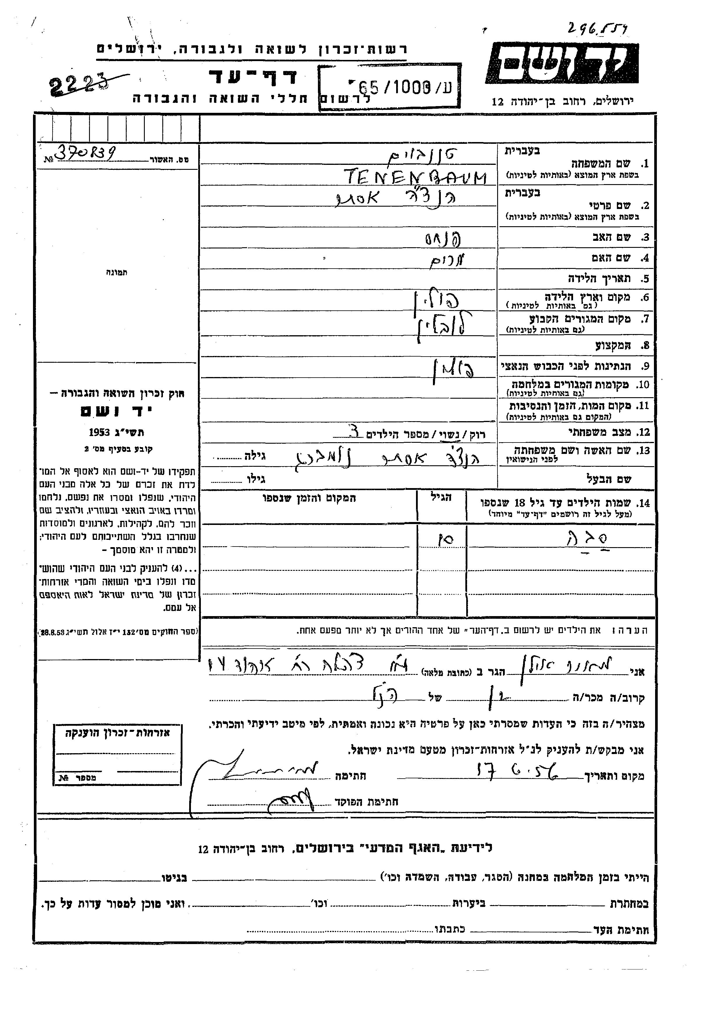 Hencha Ester Tenenbaum, geb. Nomberg wurde in Polen geboren. Sie war die Tochter von Pinkhas und Miriam. Sie war mit Shmuel Verheiratet. Vor dem Zweiten Weltkrieg lebte sie in Lublin, Polen.