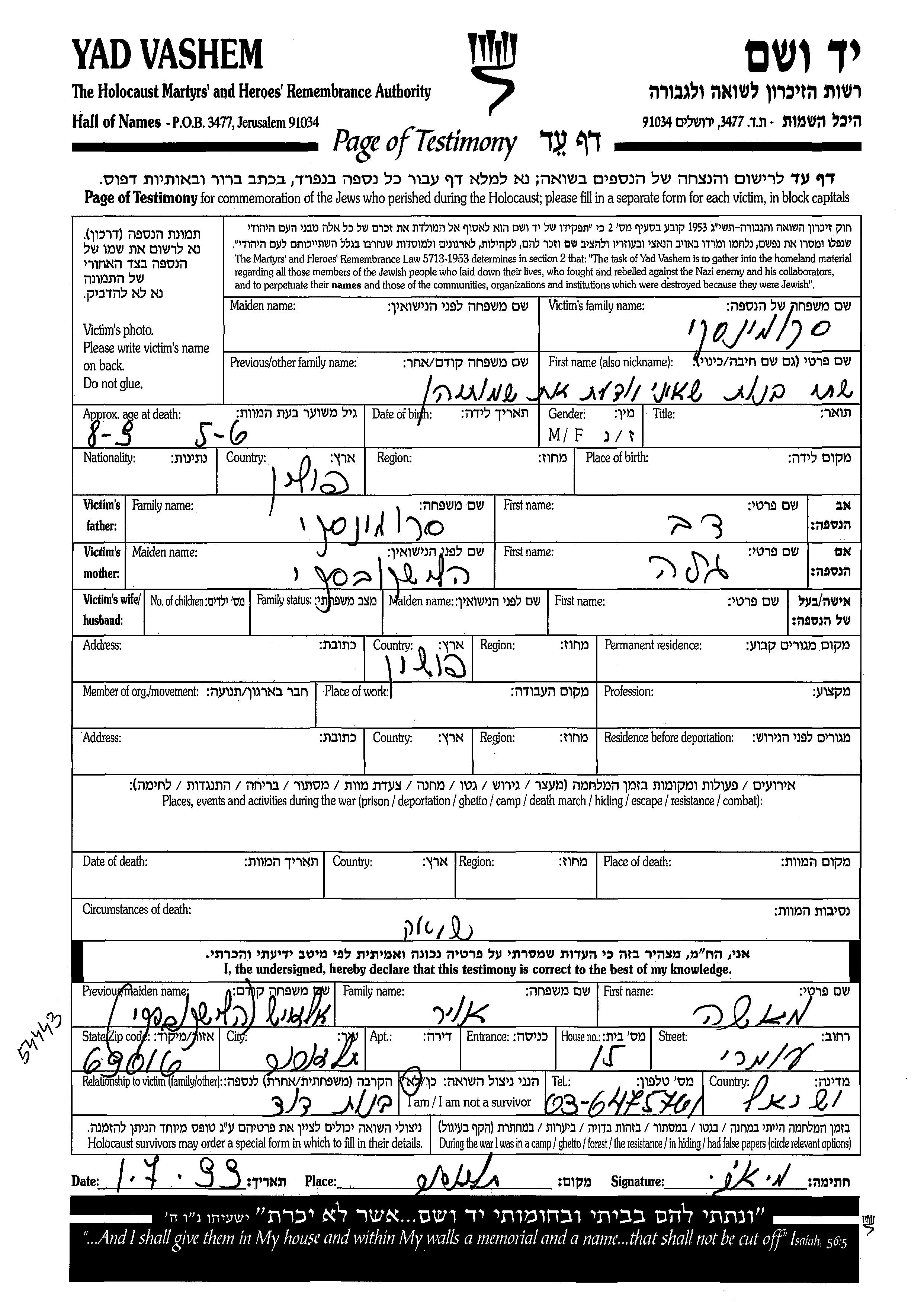 Vorname unbekannt סקומינסקי wurde in Polen geboren. Sie war die Tochter von Dov und Gela, geb. Helishkovski. Sie war Kind. Vor dem Zweiten Weltkrieg lebte sie in Polen.