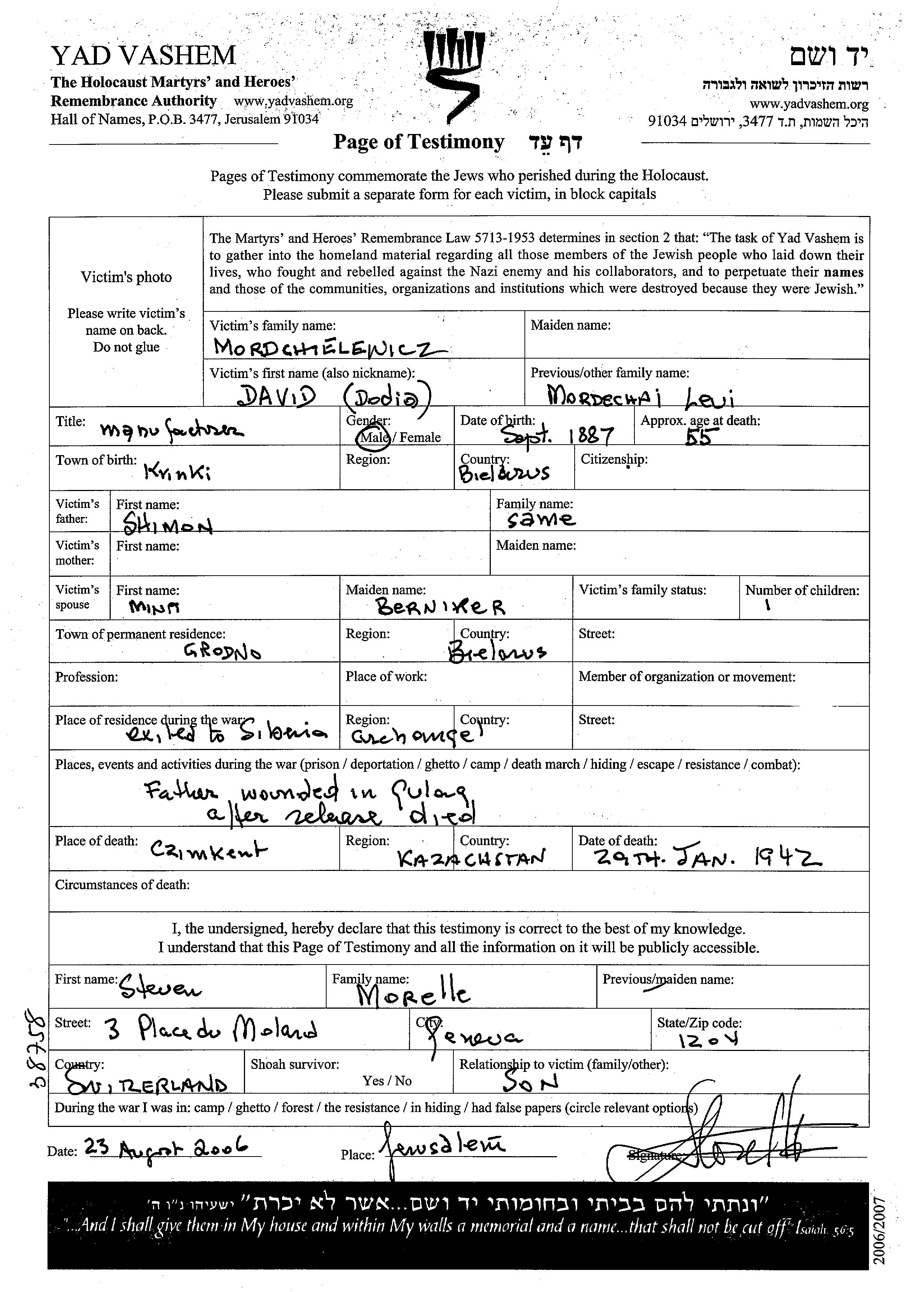 David Mordchielewicz wurde im Jahr 1887 in Krinki, Polen geboren. Er war der Sohn von Shimon. Er war mit Mina, geb. Berniker Verheiratet. Vor dem Zweiten Weltkrieg lebte er in Grodno, Polen. Während des Krieges war er in Siberia Region, Russland (UdSSR).