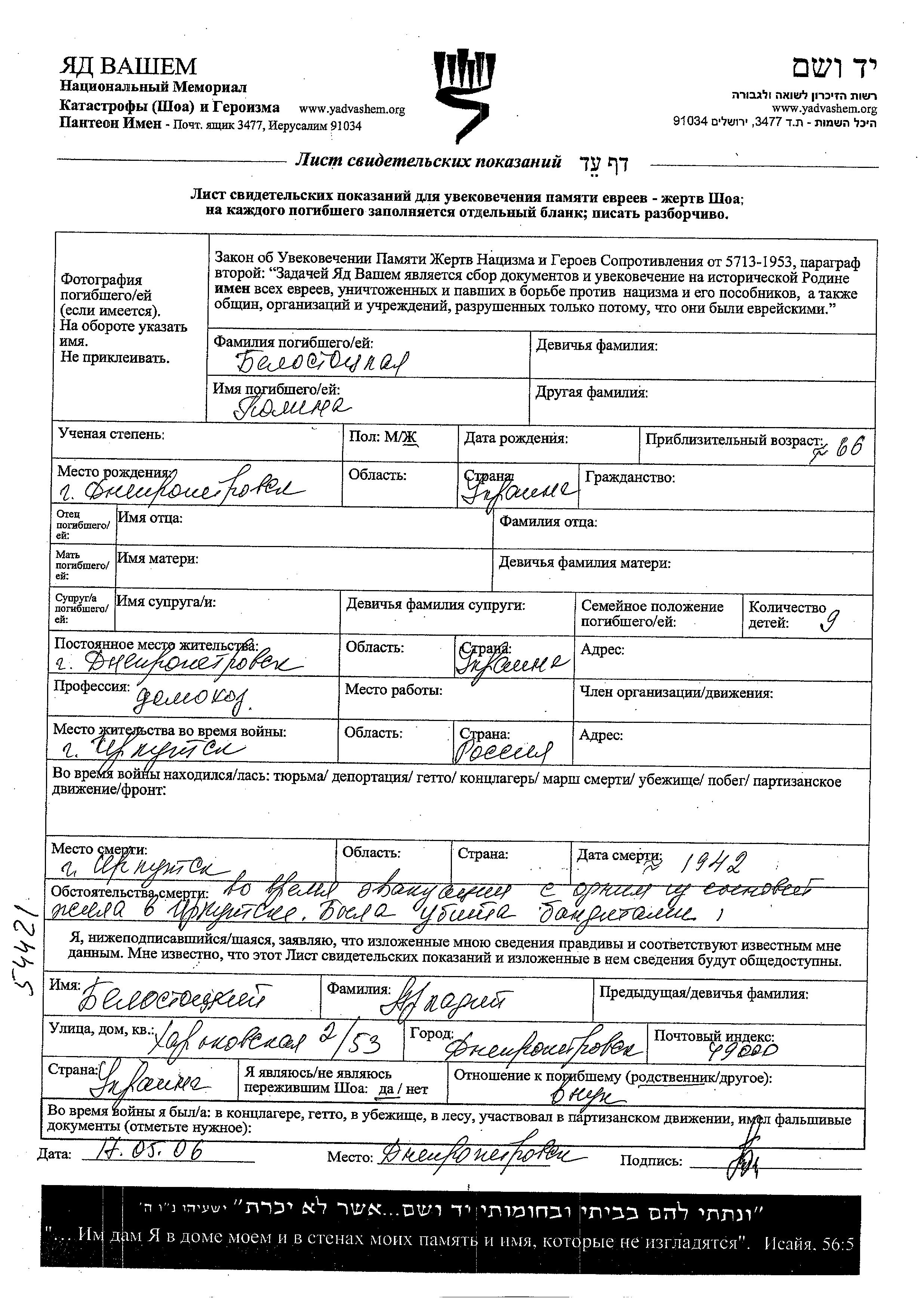 Polina Belostotzkaya wurde in Dnepropetrovsk, Ukraine (UdSSR) geboren. Sie war Hausfrau. Vor dem Zweiten Weltkrieg lebte sie in Dnepropetrovsk, Ukraine (UdSSR).