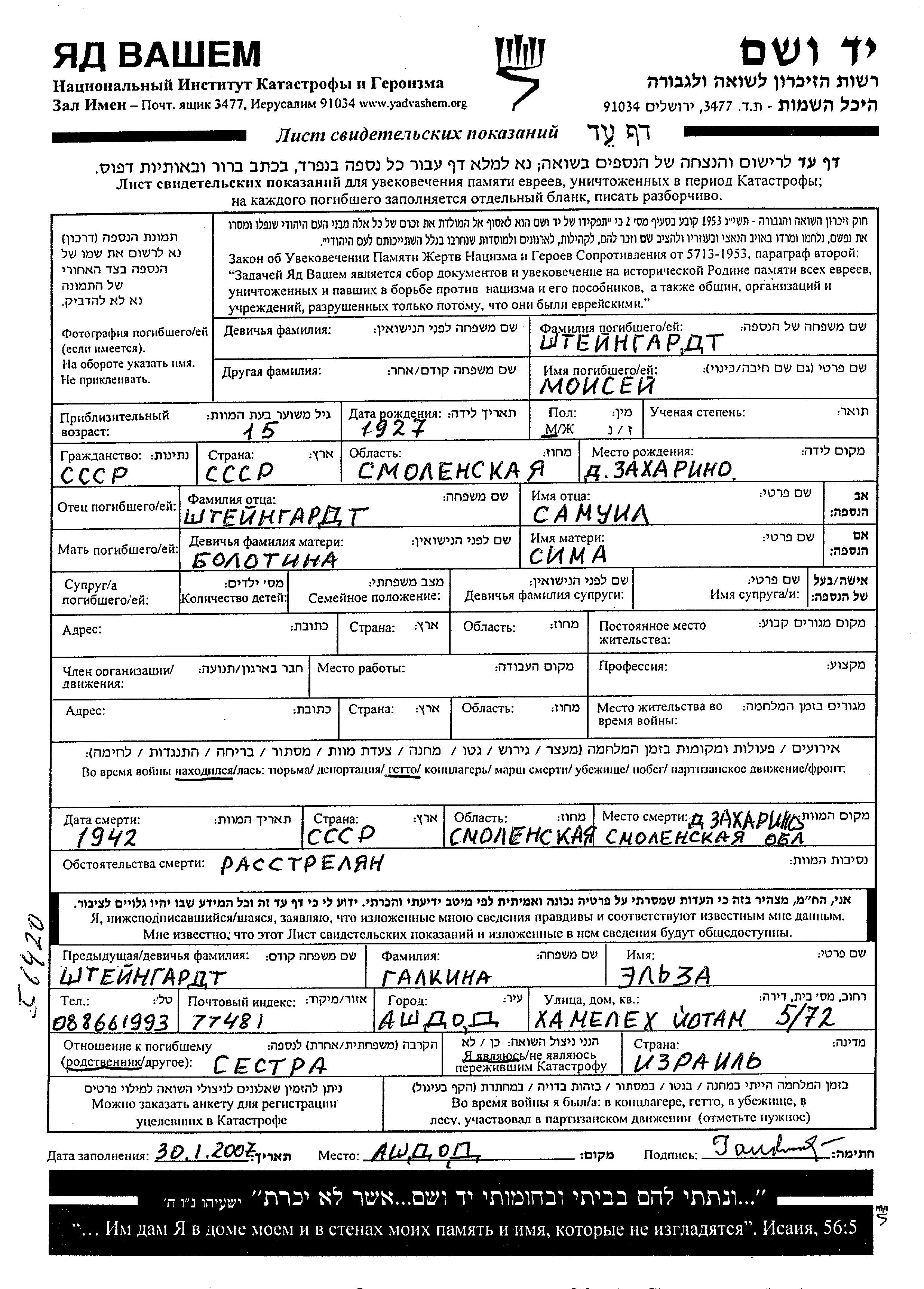 Moisei Shteingard wurde im Jahr 1927 in Zakharino, Russland (UdSSR) geboren. Er war der Sohn von Samuil und Sima, geb. Bolotina. Er war Ledig. Vor dem Zweiten Weltkrieg lebte er in Zakharino, Russland (UdSSR). Während des Krieges war er in Getto.