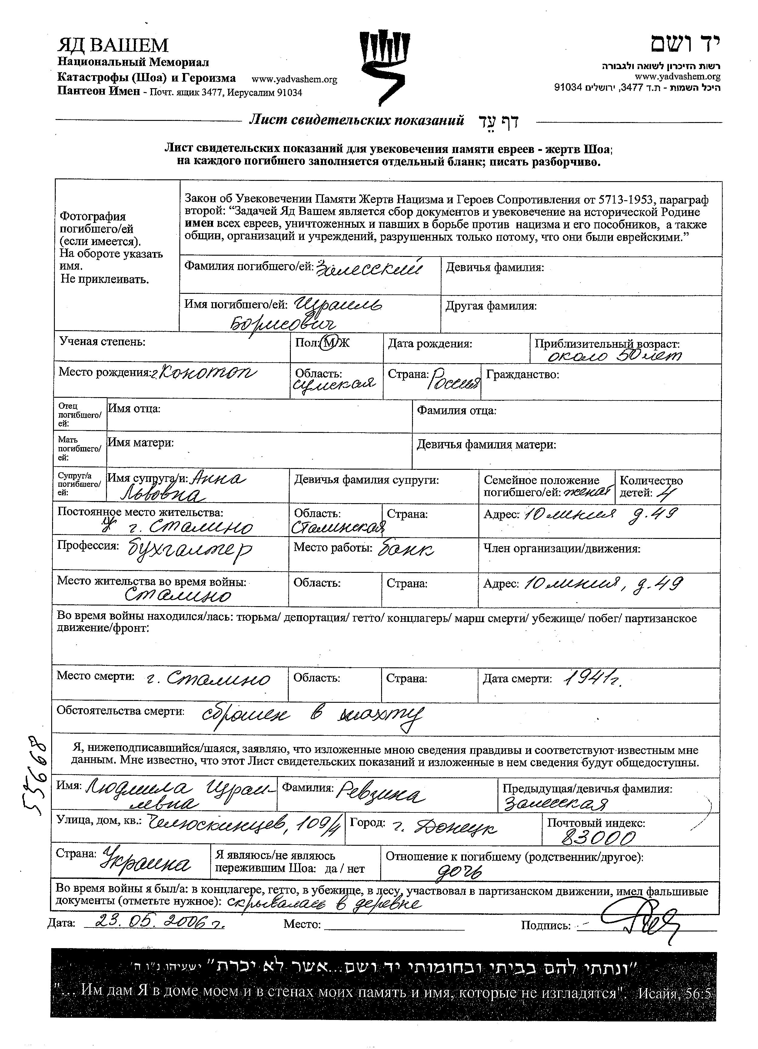 Izrail wurde in der Schoah ermordet. Todesort: Stalino, Ukraine (UdSSR) im Jahr 1941.