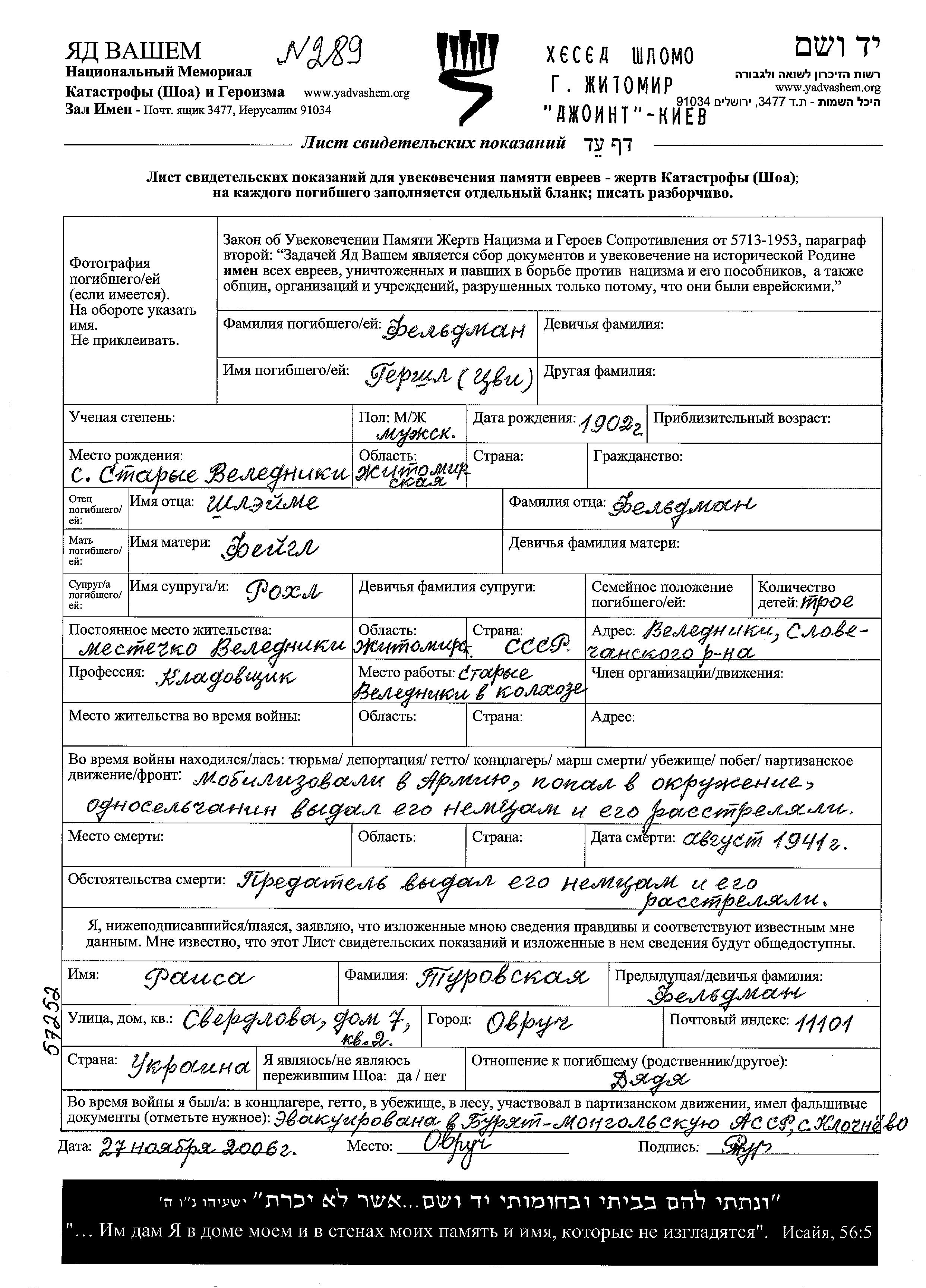 Gershl Tzvi Feldman wurde im Jahr 1902 in Veledniki, Ukraine (UdSSR) geboren. Er war der Sohn von Shleime und Feigl. Er war Lagerverwalter und mit Rokhl Verheiratet. Vor dem Zweiten Weltkrieg lebte er in Veledniki, Ukraine (UdSSR). Während des Krieges war er in die Sowjetischen Streitkräfte.