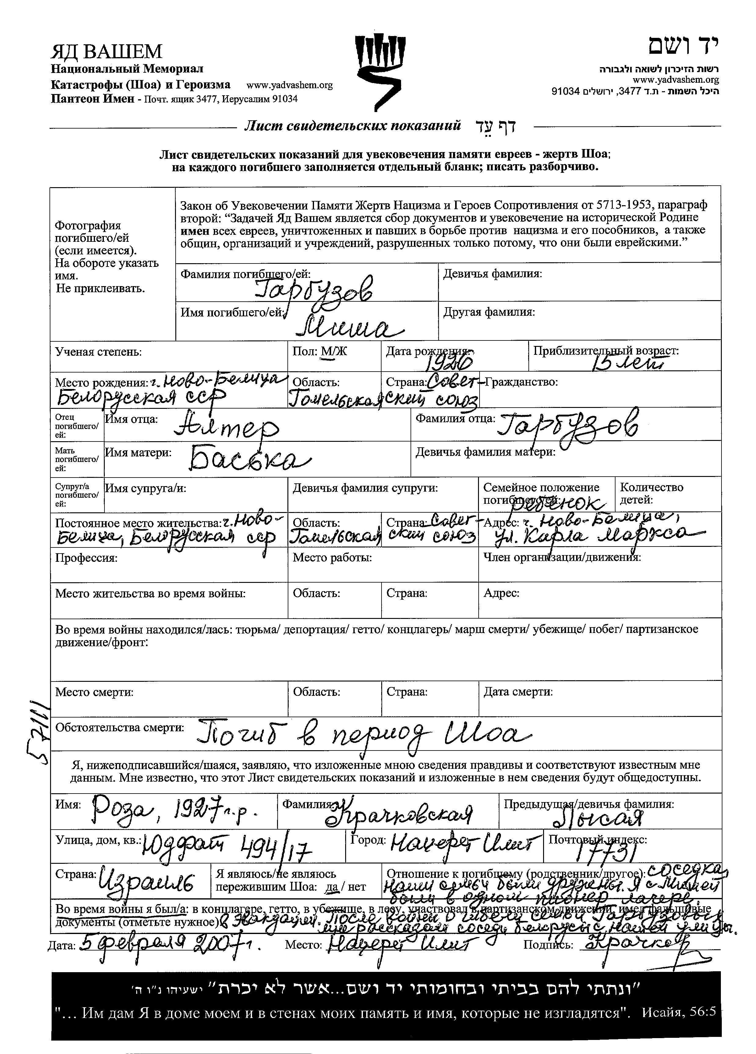 Garbuzov Misha 1926 Novobelitsa, Weißrussland (UdSSR) Gedenkblatt