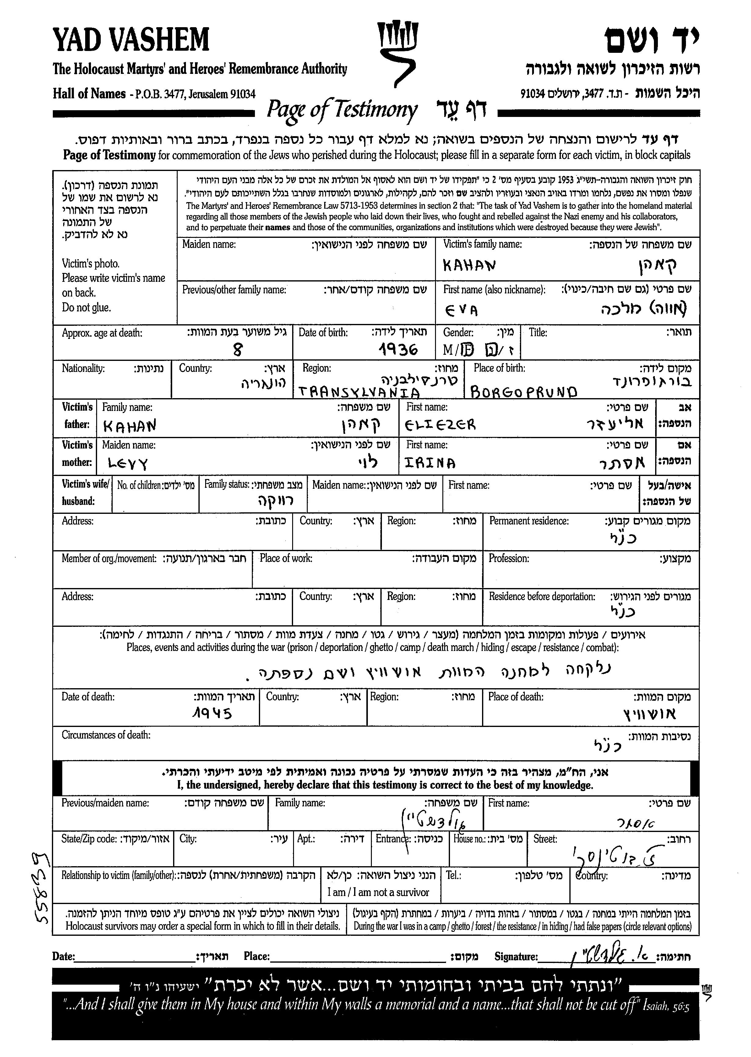 Eva Malka Kahan wurde im Jahr 1936 in Borgoprund, Rumänien geboren. Sie war die Tochter von Eliezer und Esther Irina, geb. Levi. Sie war Kind. Vor dem Zweiten Weltkrieg lebte sie in Borgoprund, Rumänien. Während des Krieges war sie in Borgoprund, Rumänien.