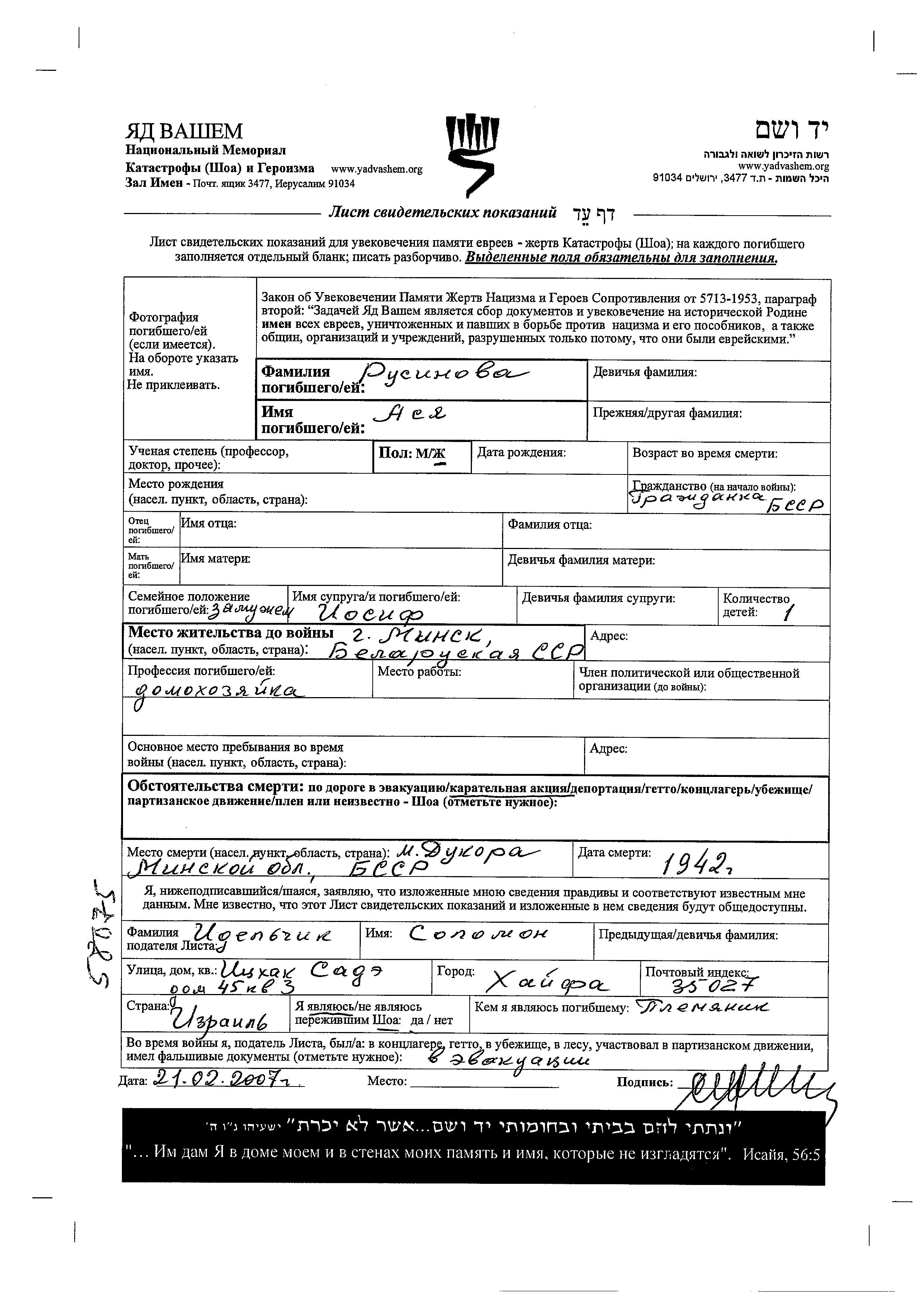 Asya Rusinova. Sie war Hausfrau und mit Iosif Verheiratet. Vor dem Zweiten Weltkrieg lebte sie in Minsk, Weißrussland (UdSSR). Während des Krieges war sie in Dukora, Weißrussland (UdSSR).