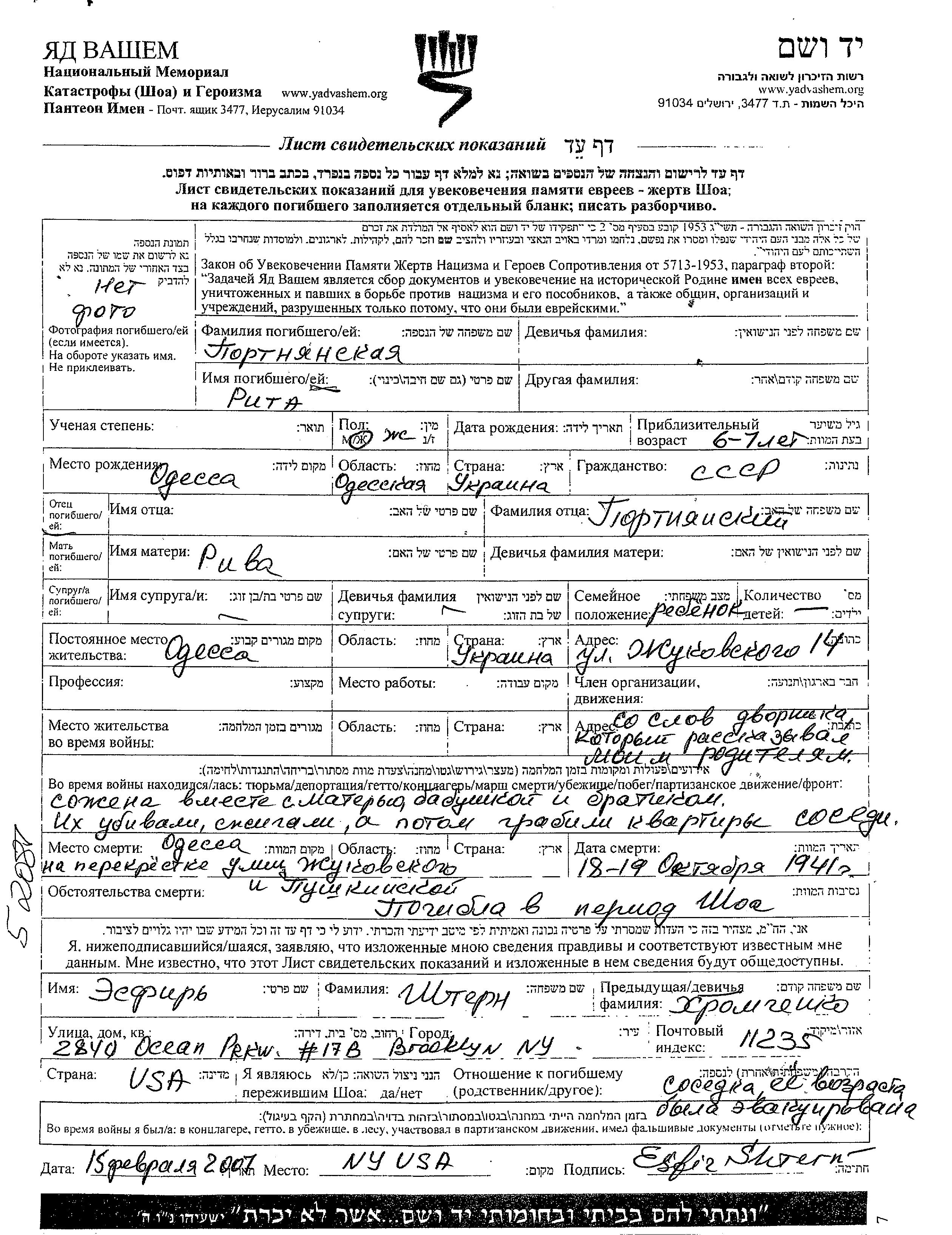 Rita Portnyanskaya wurde in Odessa, Ukraine (UdSSR) geboren. Sie war die Tochter von Riva. Sie war Kind. Vor dem Zweiten Weltkrieg lebte sie in Odessa, Ukraine (UdSSR). Während des Krieges war sie in Odessa, Ukraine (UdSSR).