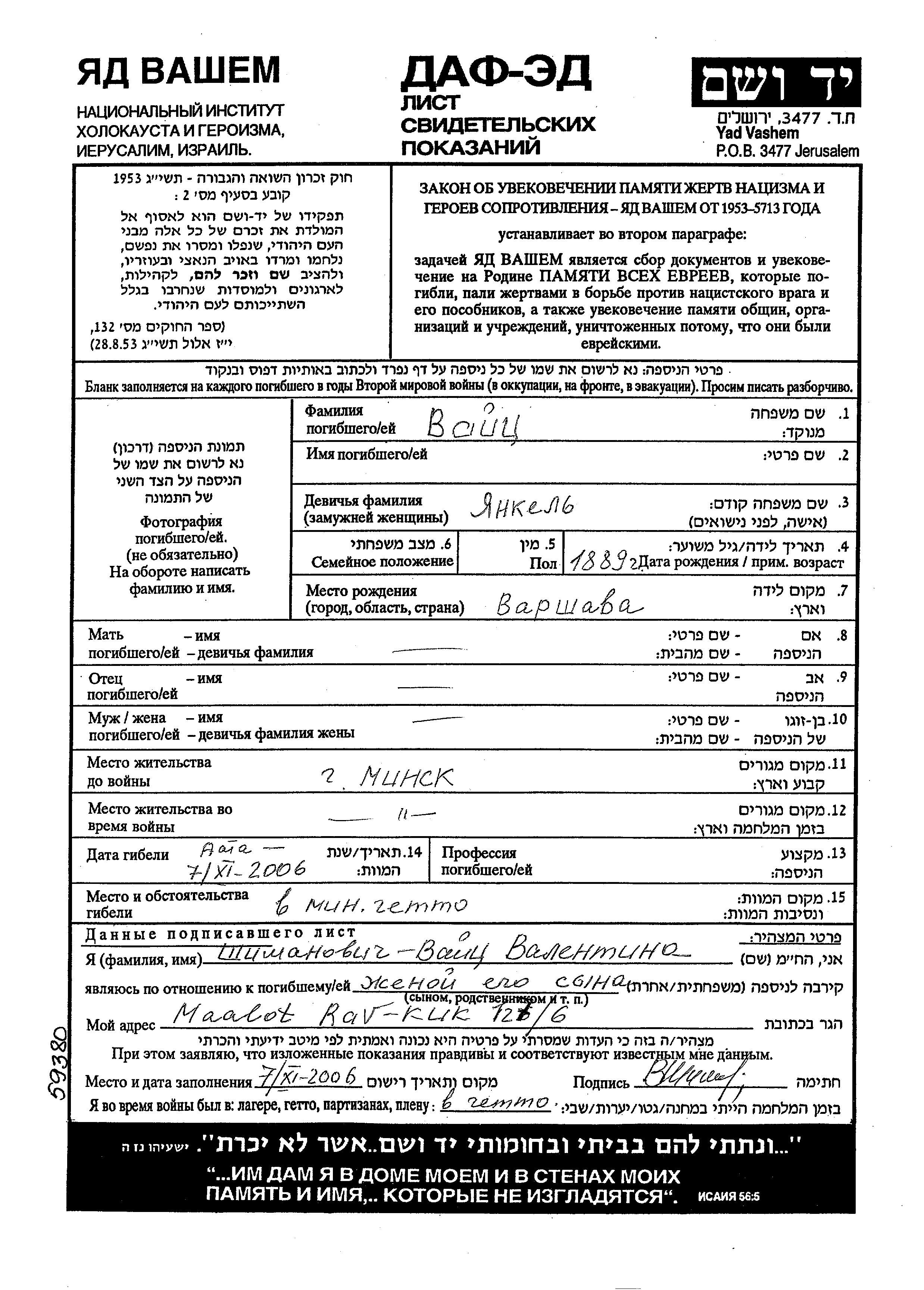 Yankel Vaitz wurde im Jahr 1889 in Warszawa, Polen geboren. Er war Verheiratet. Vor dem Zweiten Weltkrieg lebte er in Minsk, Weißrussland (UdSSR). Während des Krieges war er in Minsk, Weißrussland (UdSSR).