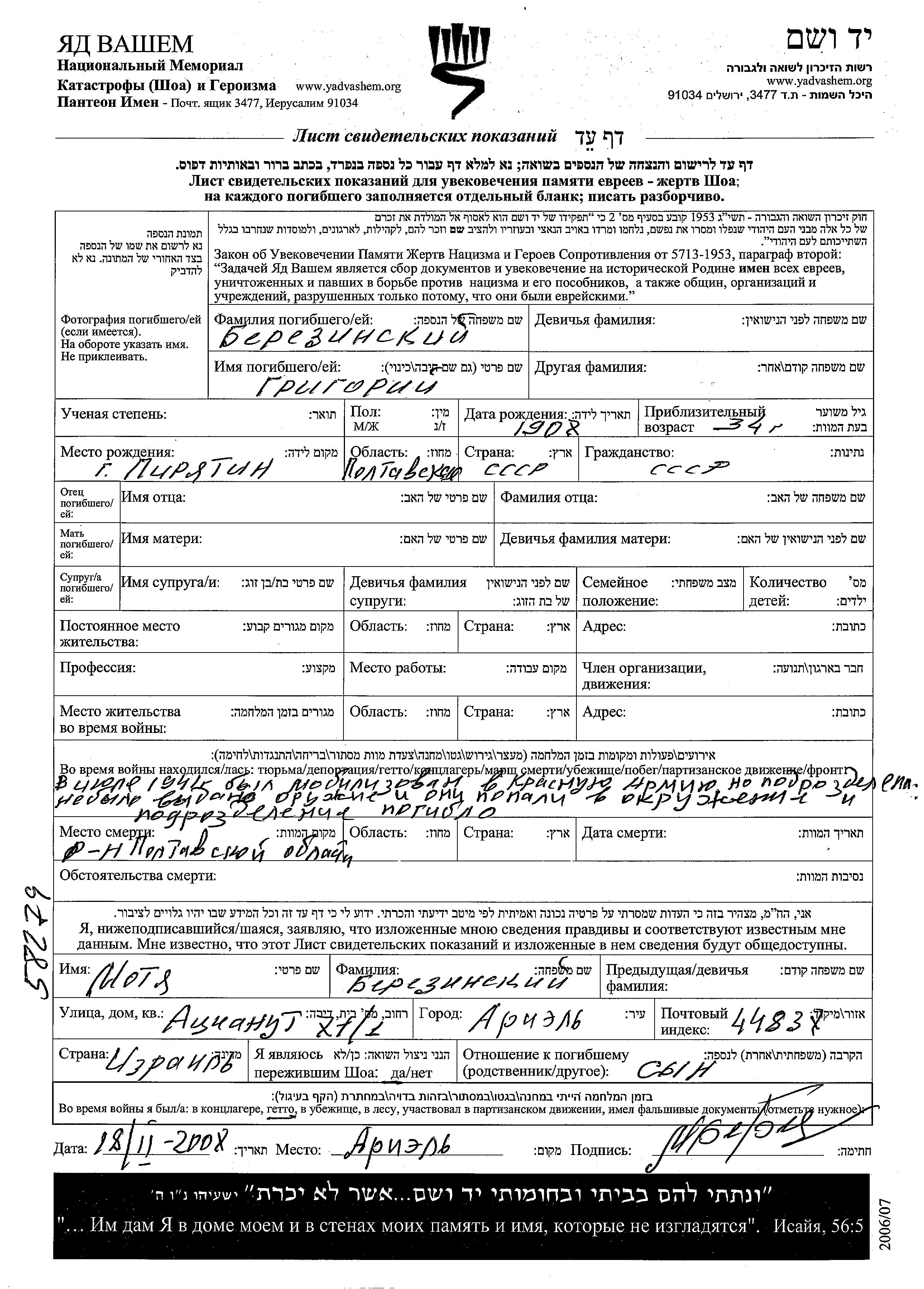 Berezinski Grigoriy 1908 Piryatin, Ukraine (UdSSR) Gedenkblatt