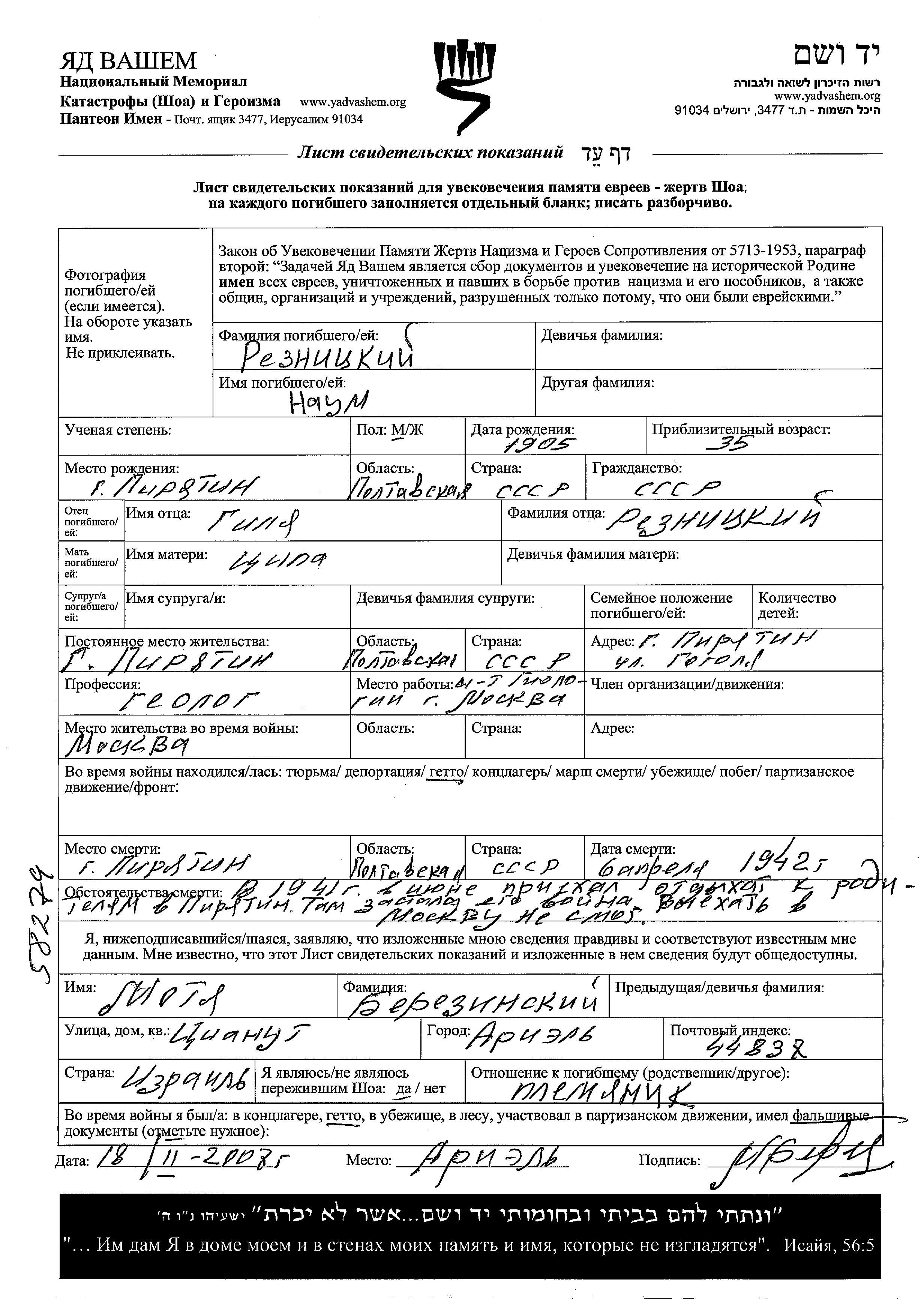 Naum Reznitzkiy wurde im Jahr 1905 in Piryatin, Ukraine (UdSSR) geboren. Er war der Sohn von Gilya und Tzipa. Er war Geolog. Vor dem Zweiten Weltkrieg lebte er in Moskva, Russland (UdSSR). Während des Krieges war er in Piryatin, Ukraine (UdSSR).