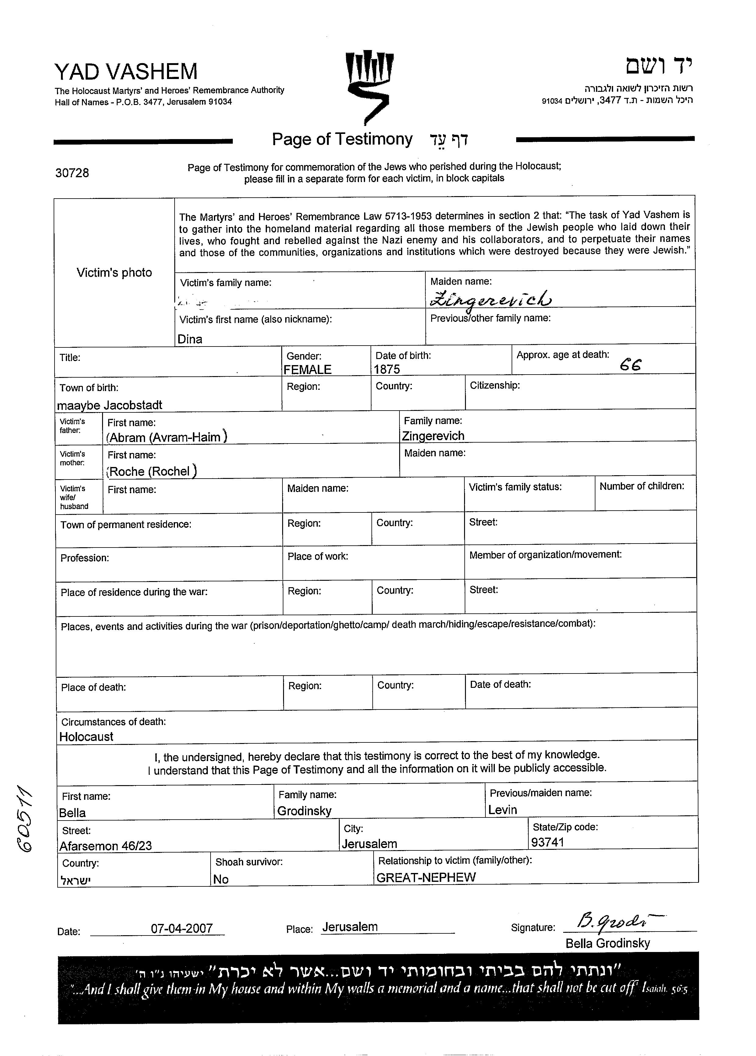 Dina Zingerevich wurde im Jahr 1875 in Jakobstadt, Lettland geboren. Sie war die Tochter von Haim Avram und Rochel. Vor dem Zweiten Weltkrieg lebte sie in Lettland.