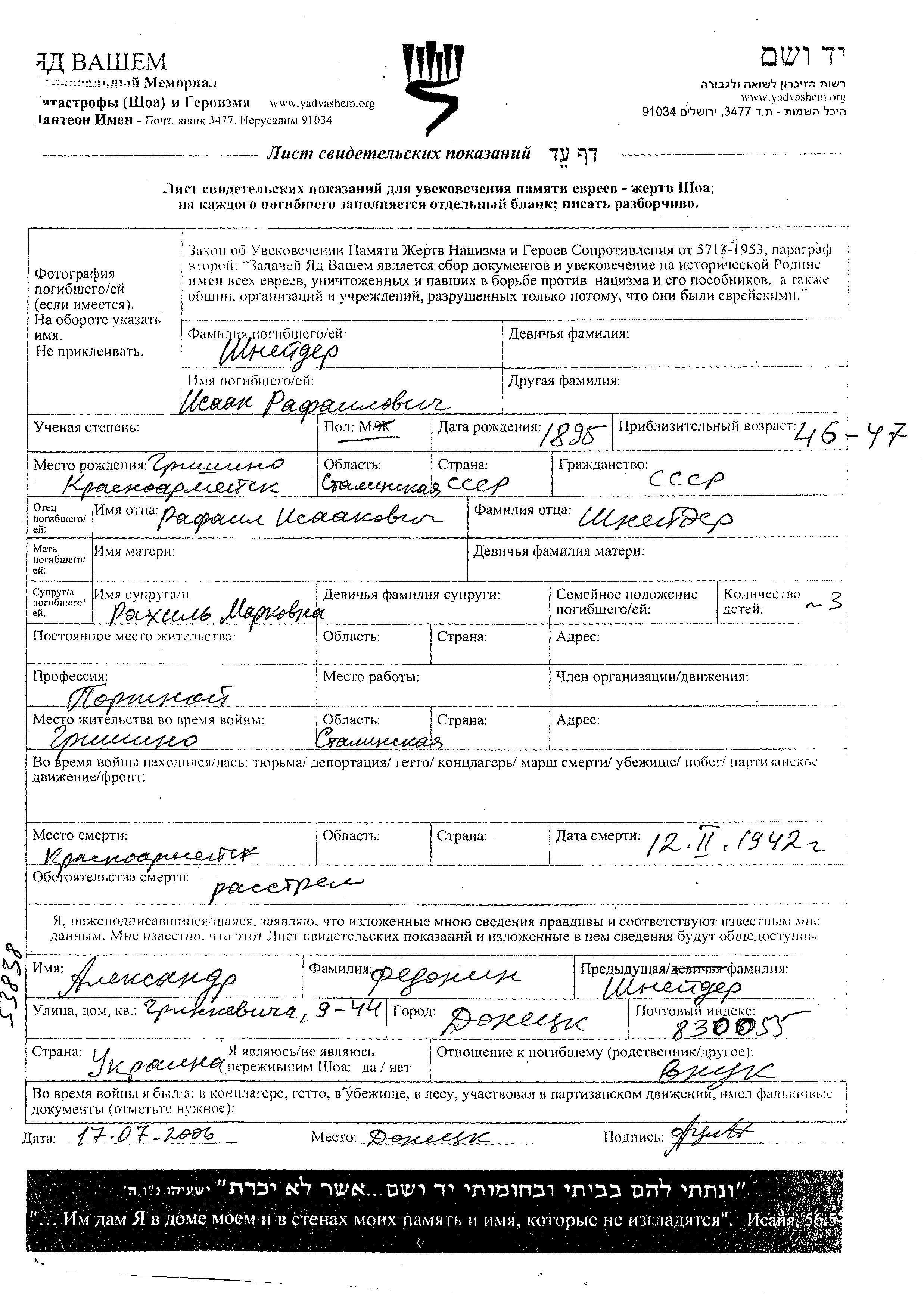 Isaak Shneider wurde im Jahr 1895 in Grishino Village, Ukraine (UdSSR) geboren. Er war der Sohn von Rafail. Er war Schneider und mit Rakhil Verheiratet. Vor dem Zweiten Weltkrieg lebte er in Grishino Village, Ukraine (UdSSR). Während des Krieges war er in Krasnoarmeysk, Ukraine (UdSSR).