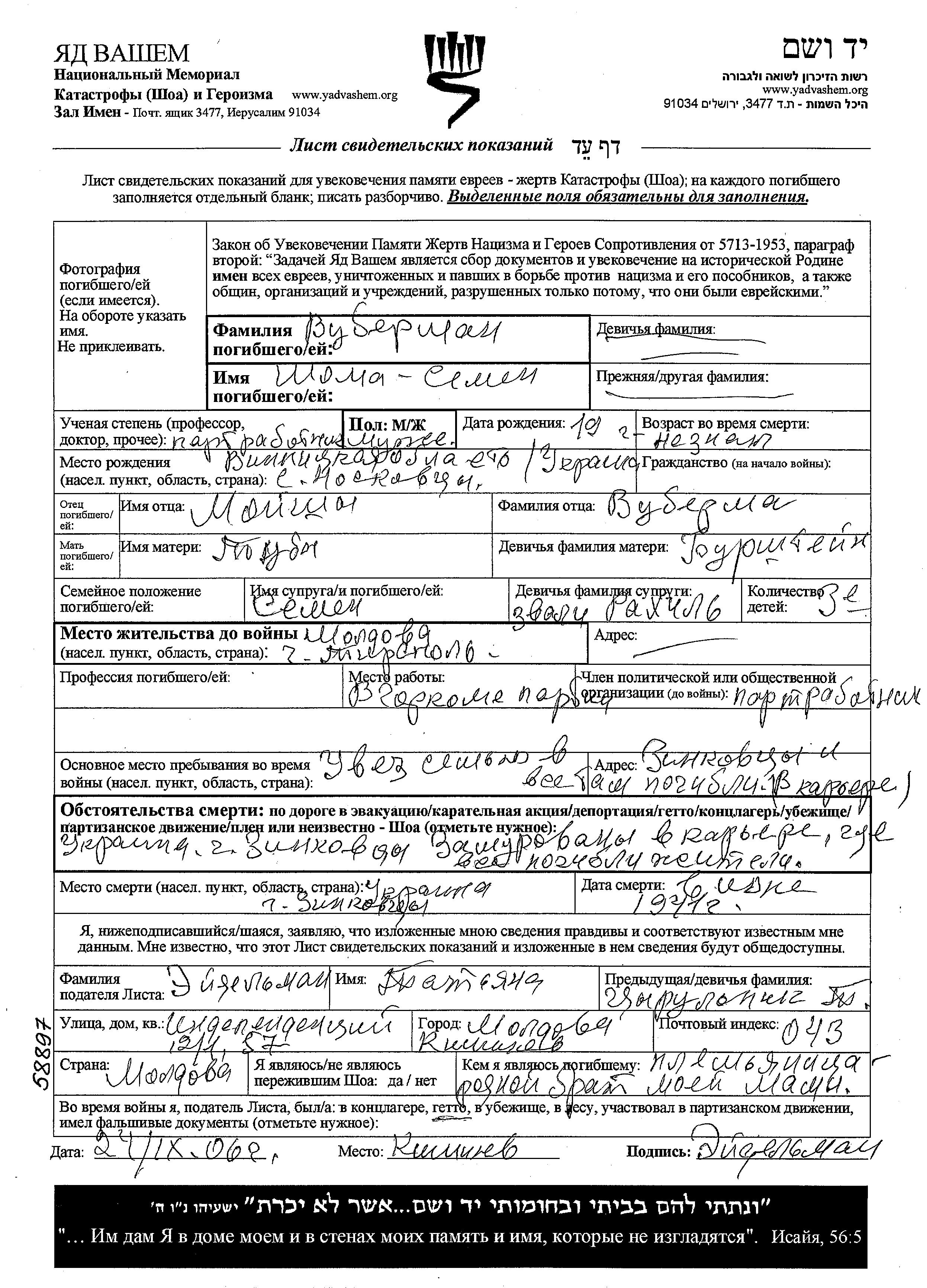 Shoma Semen wurde in der Schoah ermordet. Todesort: Zinkovtsy, Ukraine (UdSSR) im Jahr 06/1941.