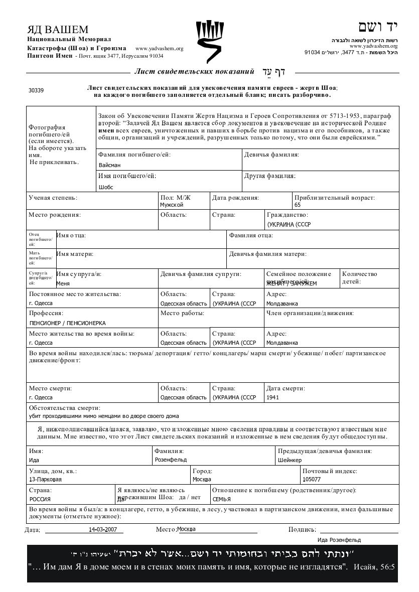 Shobs Vaisman wurde in Ukraine (UdSSR) geboren. Er war Rentner/-in und mit Menya Verheiratet. Vor dem Zweiten Weltkrieg lebte er in Odessa, Ukraine (UdSSR). Während des Krieges war er in Odessa, Ukraine (UdSSR).