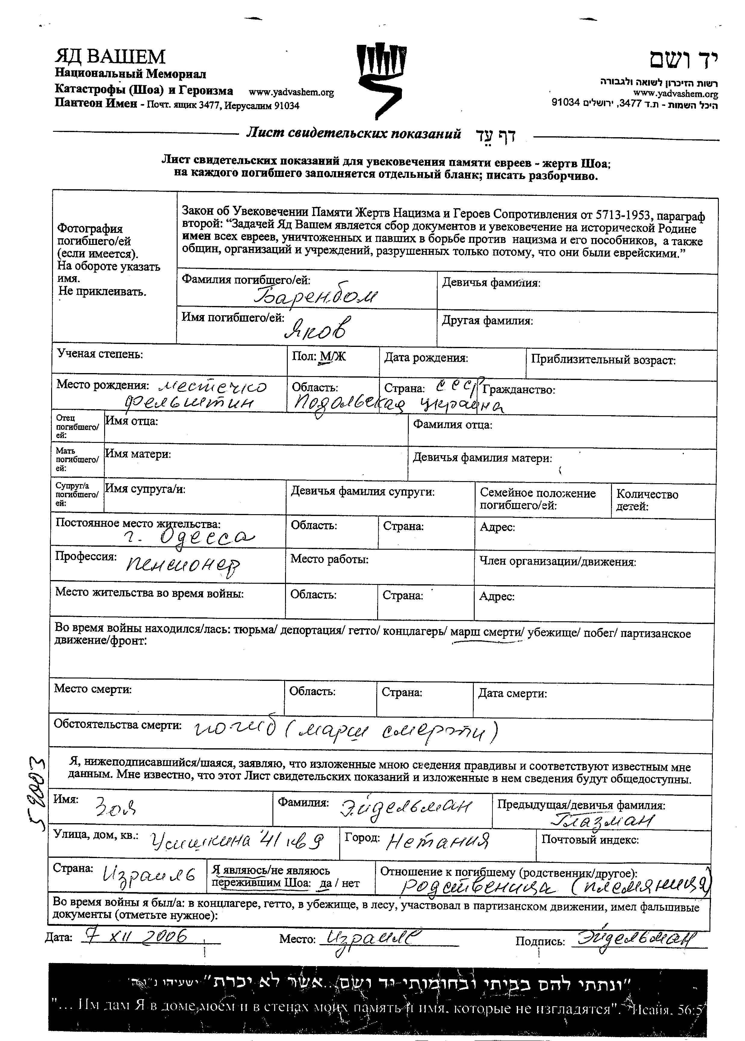 Yakov Barenbom wurde in Felshtin, Ukraine (UdSSR) geboren. Er war Rentner/-in. Vor dem Zweiten Weltkrieg lebte er in Odessa, Ukraine (UdSSR).