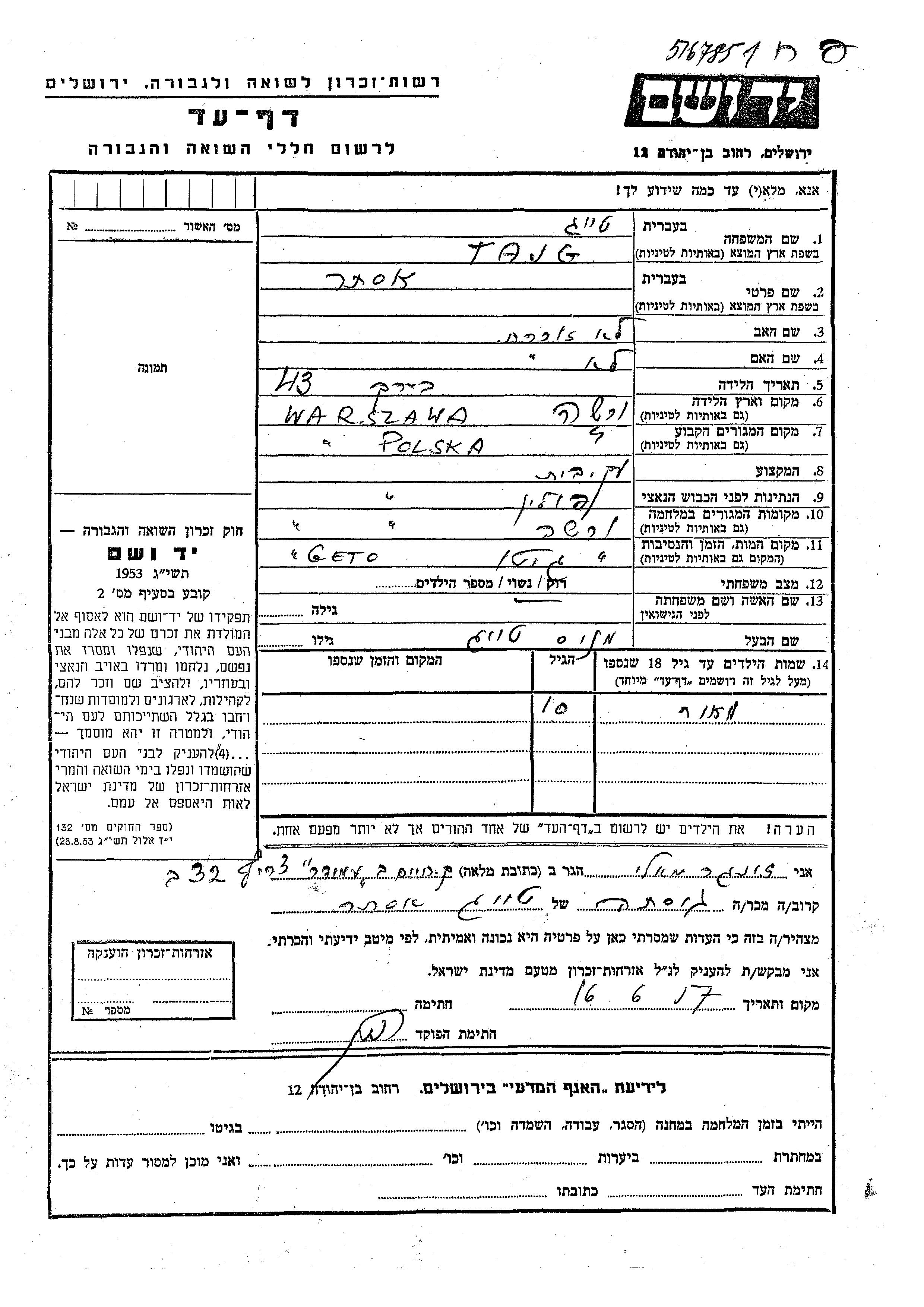 Tajg Ester Warszawa, Polen Gedenkblatt