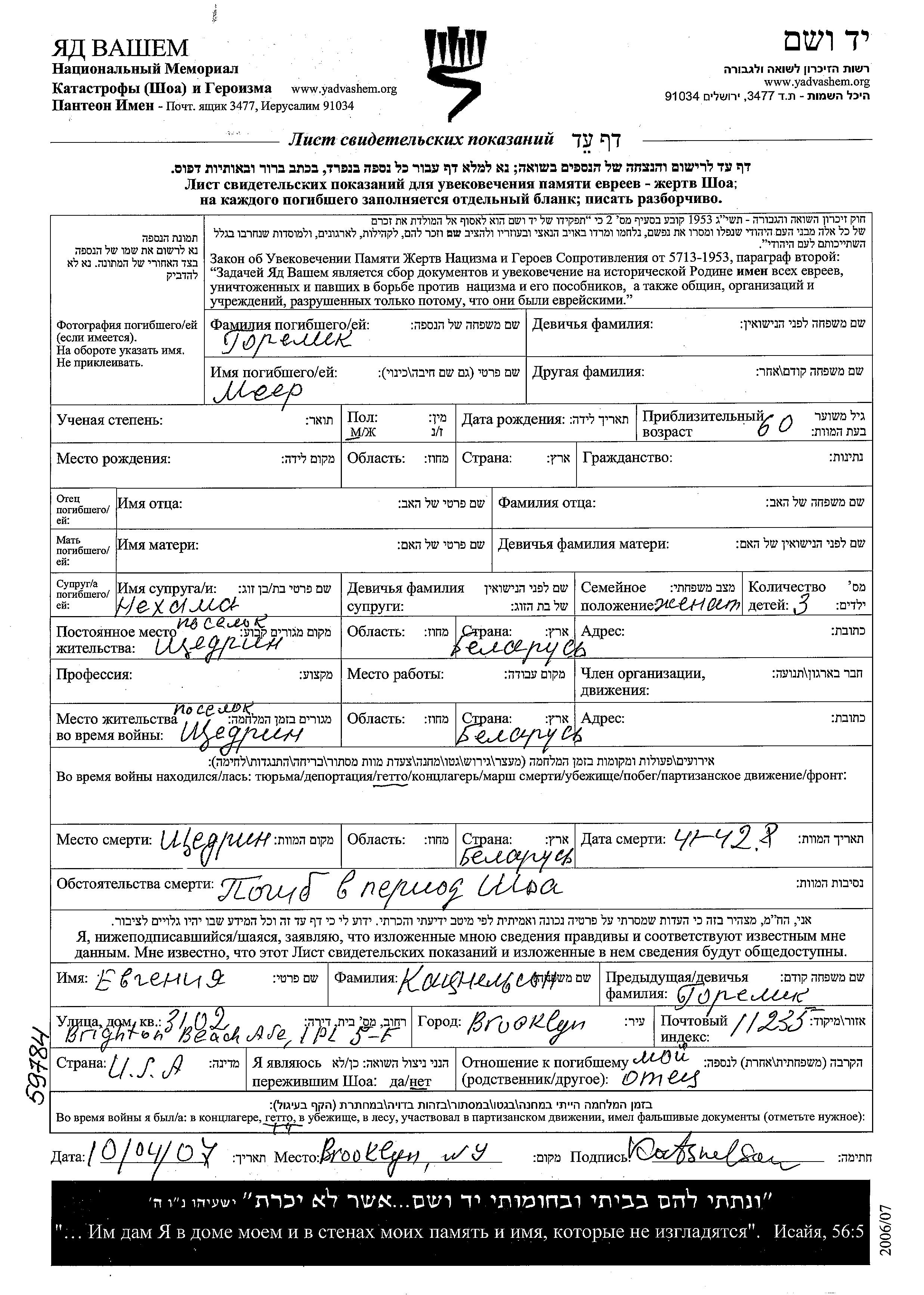 Meyer Gorelik. Er war mit Nekhama Verheiratet. Vor dem Zweiten Weltkrieg lebte er in Shchedrin, Weißrussland (UdSSR). Während des Krieges war er in Shchedrin, Weißrussland (UdSSR).