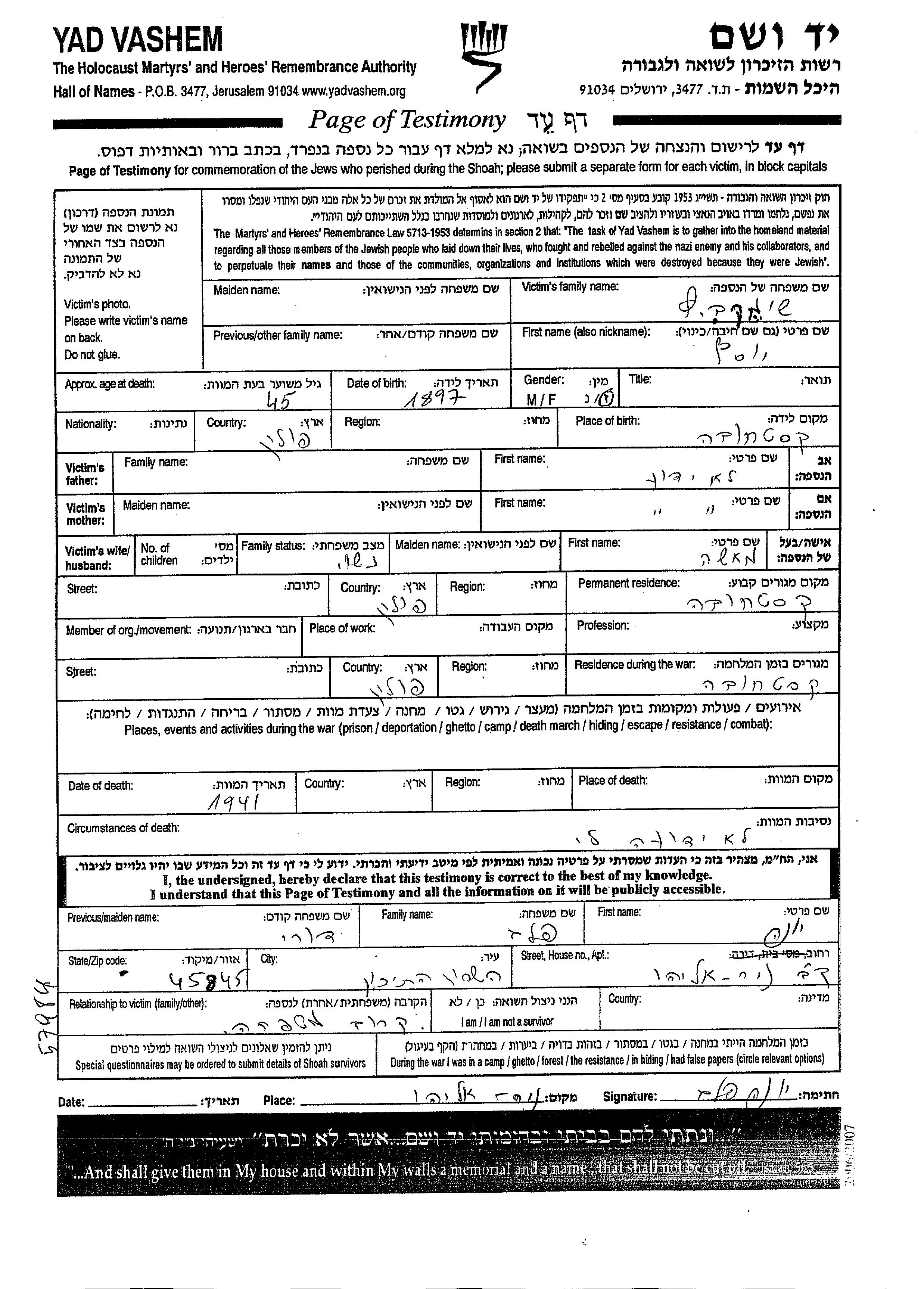 Shimkevitz Joseph 1897 Czestochowa, Polen Gedenkblatt