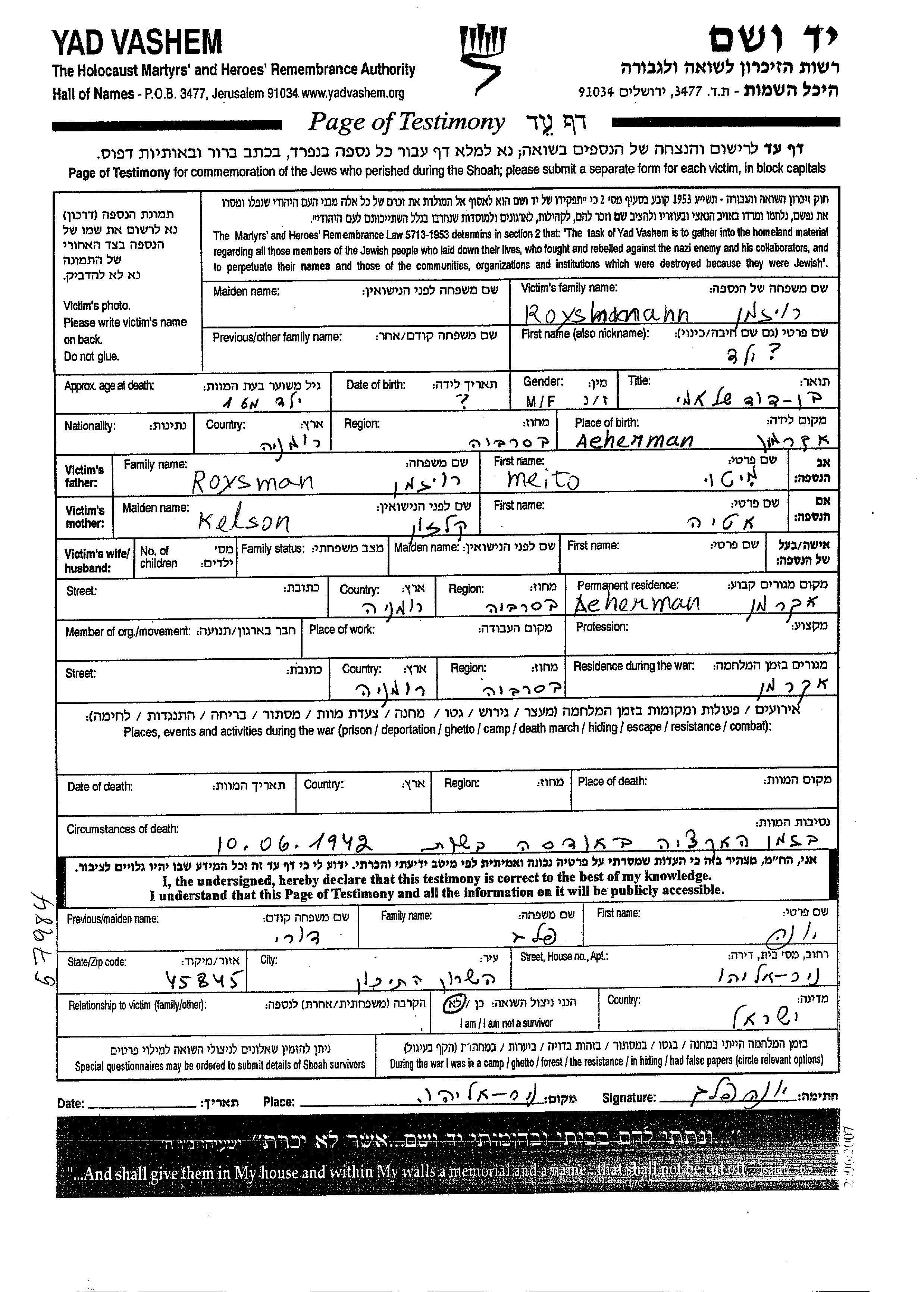 Vorname unbekannt Roizman wurde in Akerman, Rumänien geboren. Er war der Sohn von מיטו und Etya, geb. Kelzon. Er war Kind. Vor dem Zweiten Weltkrieg lebte er in Akerman, Rumänien. Während des Krieges war er in Akerman, Rumänien.
