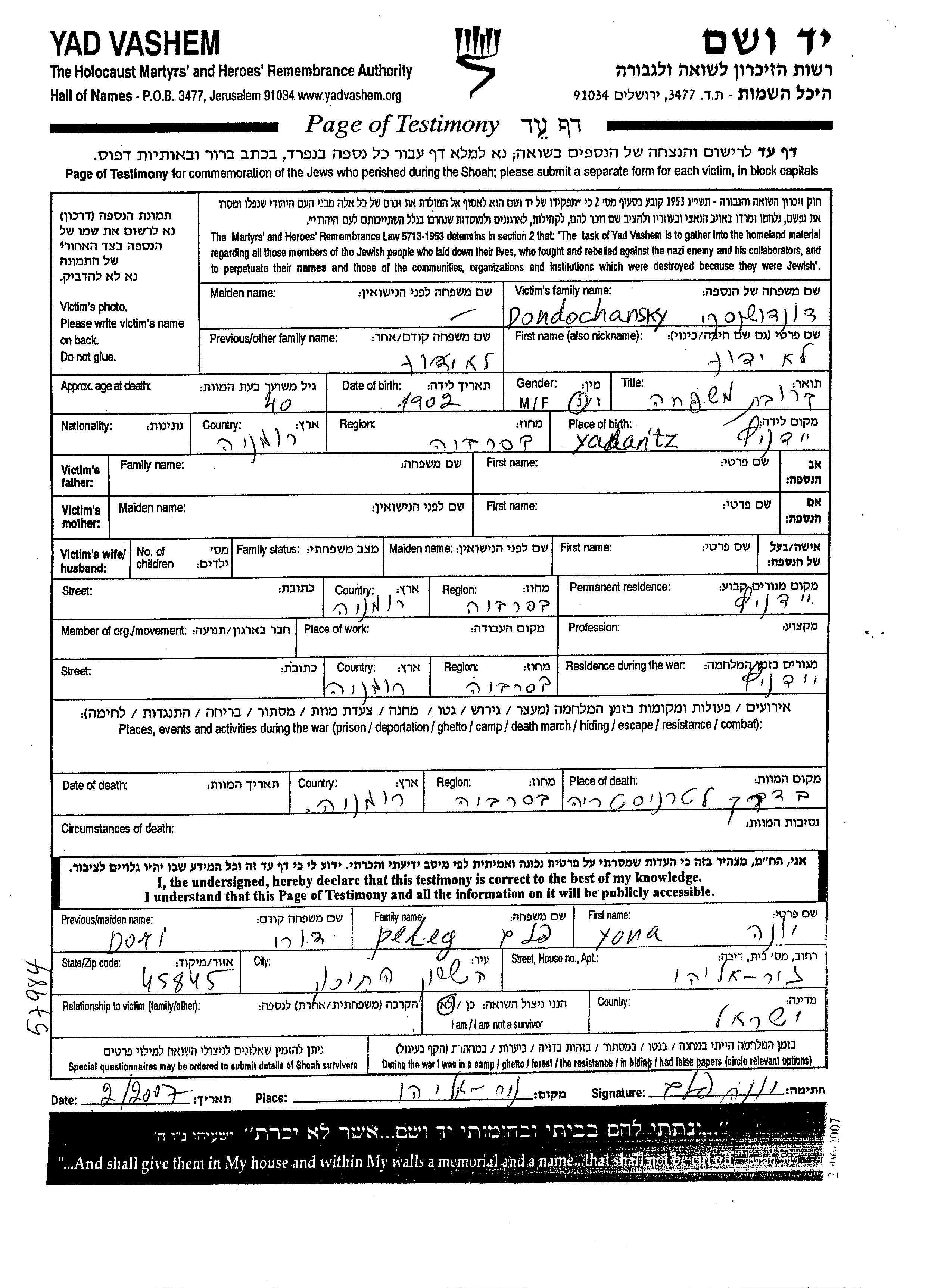 Vorname unbekannt Dondochansky wurde im Jahr 1902 in Yedenitz, Rumänien geboren. Vor dem Zweiten Weltkrieg lebte sie in Yedenitz, Rumänien. Während des Krieges war sie in Yedenitz, Rumänien.