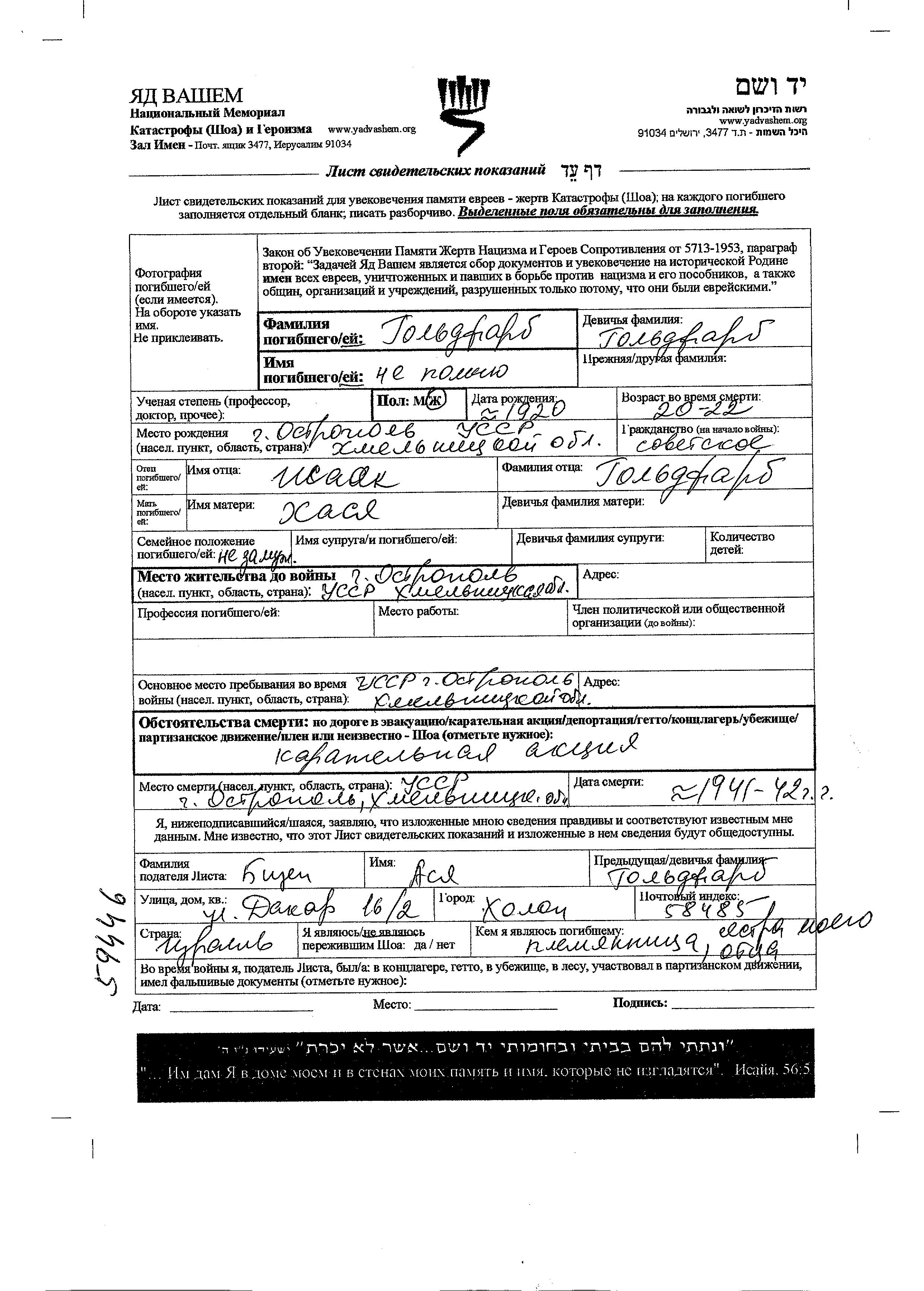 Goldfarb Vorname unbekannt 1920 Ostropol, Ukraine (UdSSR) Gedenkblatt