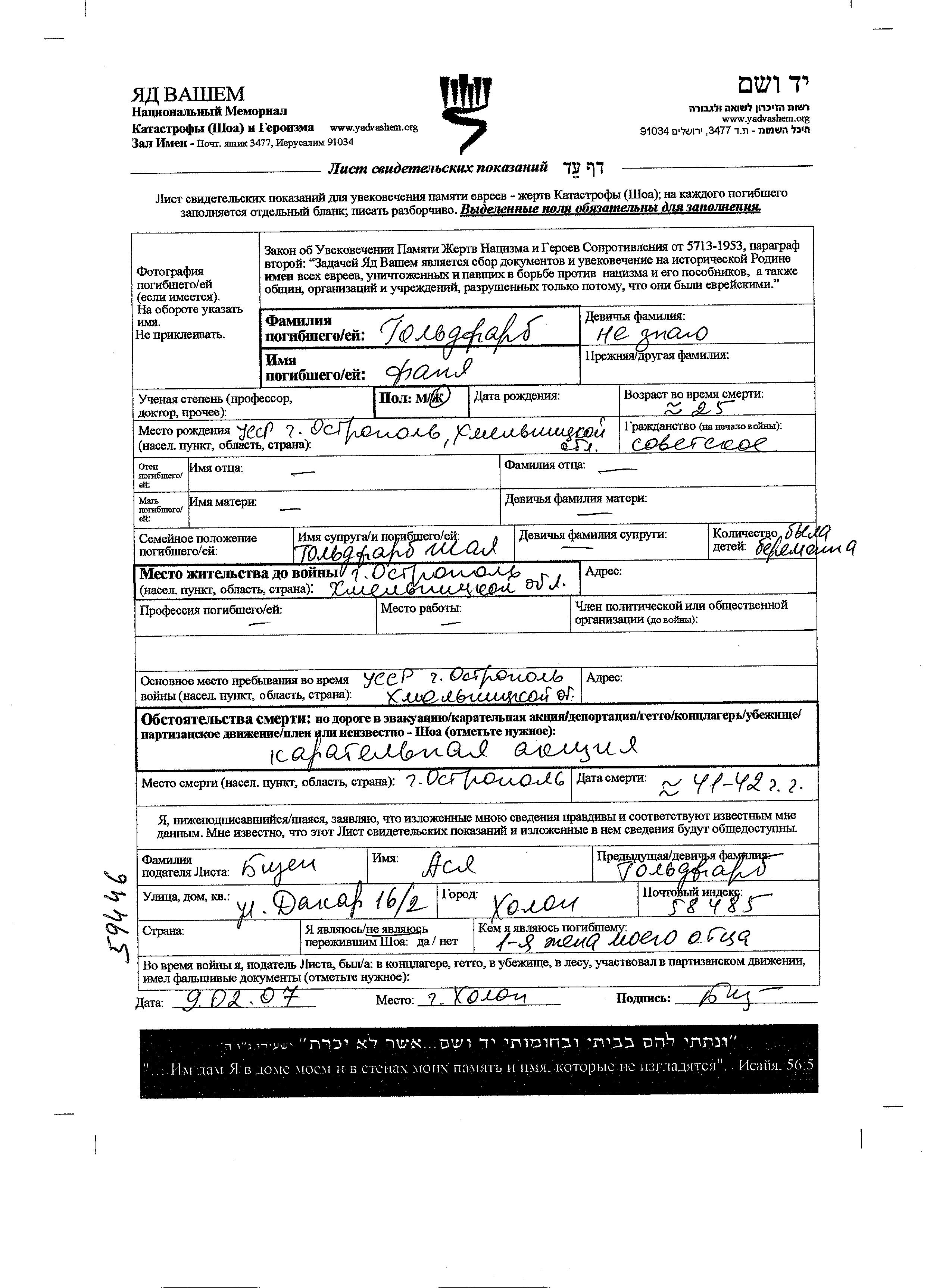 Fanya Goldfarb wurde in Ostropol, Ukraine (UdSSR) geboren. Sie war mit Shaya Verheiratet. Vor dem Zweiten Weltkrieg lebte sie in Ostropol, Ukraine (UdSSR). Während des Krieges war sie in Ostropol, Ukraine (UdSSR).
