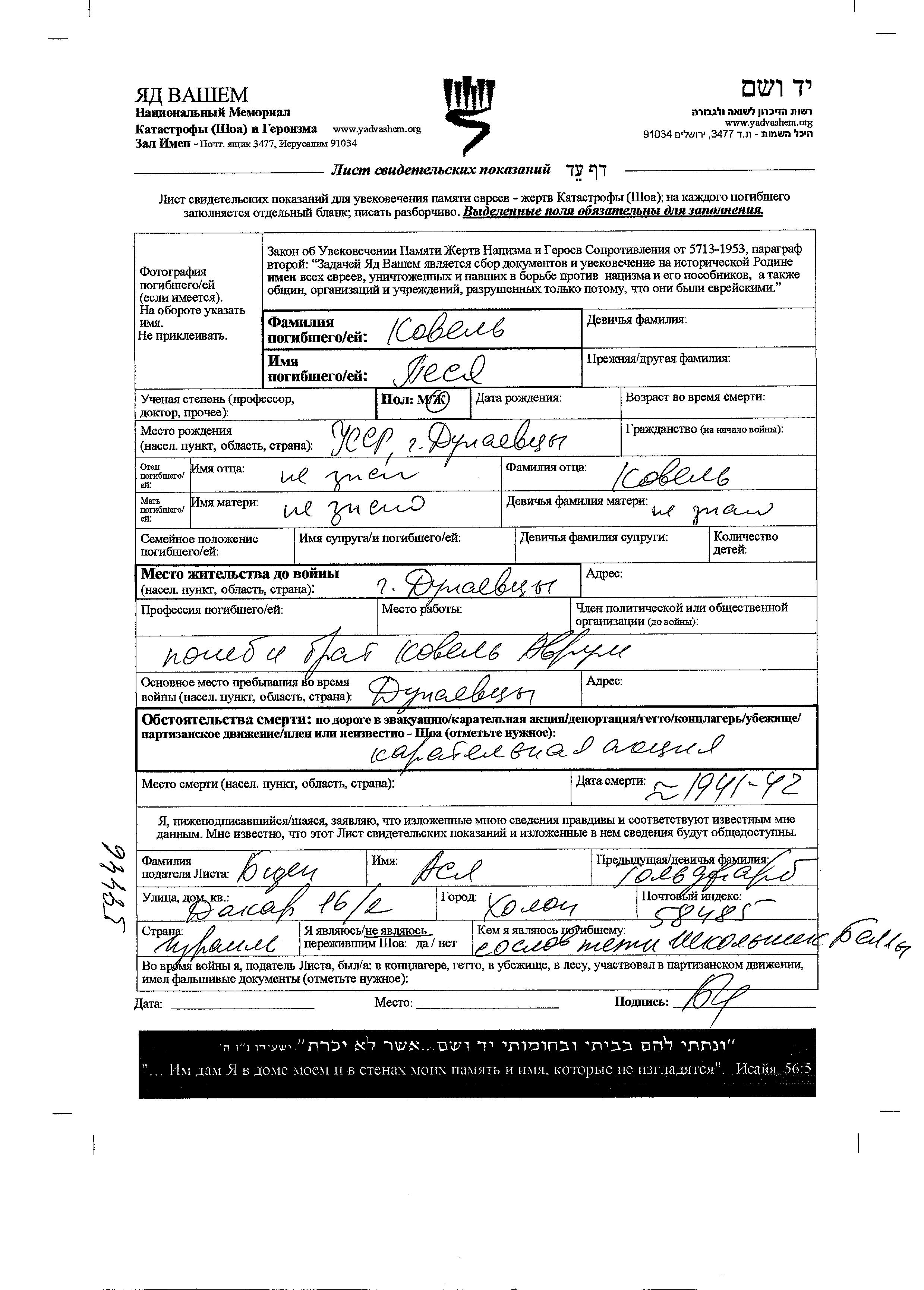 Kovel Pesya Dunayevtsy, Ukraine (UdSSR) Gedenkblatt