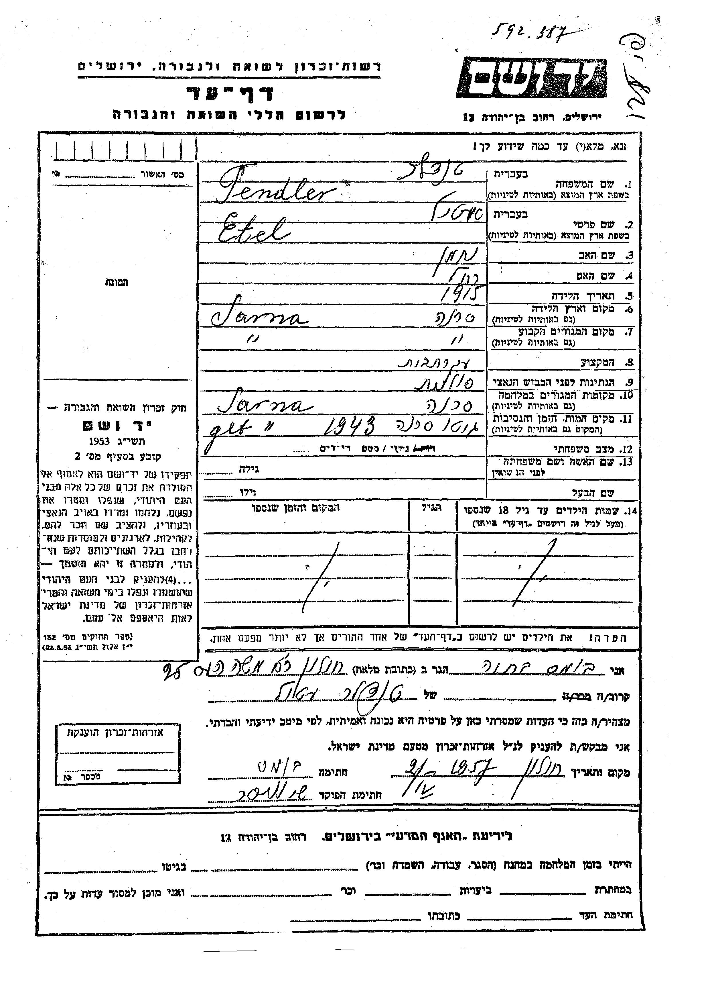 Etel Tendler wurde im Jahr 1915 in Sarna, Polen geboren. Sie war die Tochter von Nakhman und Rakhel. Sie war Hausfrau und Verheiratet. Vor dem Zweiten Weltkrieg lebte sie in Sarna, Polen. Während des Krieges war sie in Sarna, Polen.