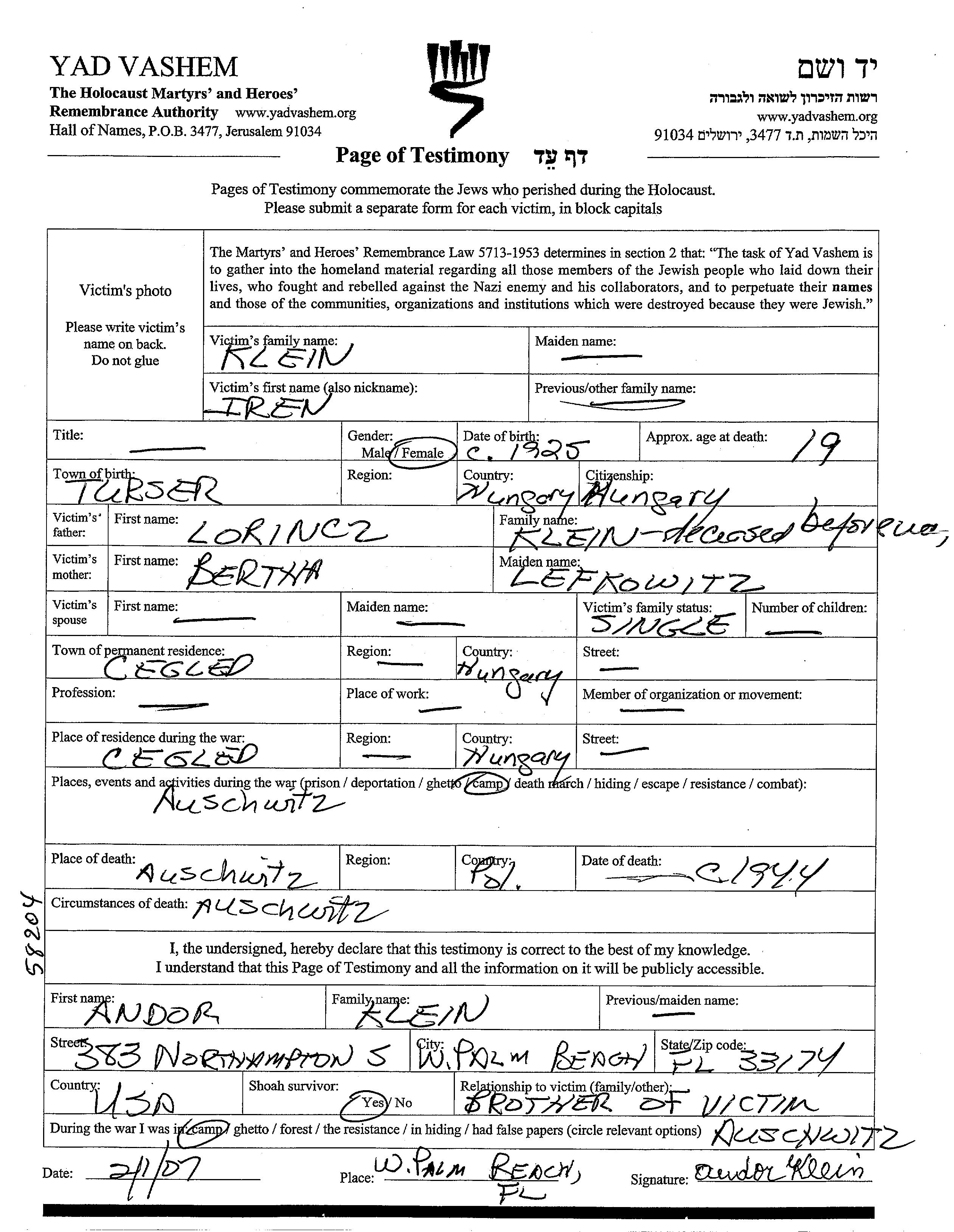 Iren Klein wurde im Jahr 1925 in Turricse, Ungarn geboren. Er war der Sohn von Lorincz und Bertha, geb. Lefkowitz. Er war Ledig. Vor dem Zweiten Weltkrieg lebte er in Cegled, Ungarn. Während des Krieges war er in Cegled, Ungarn.