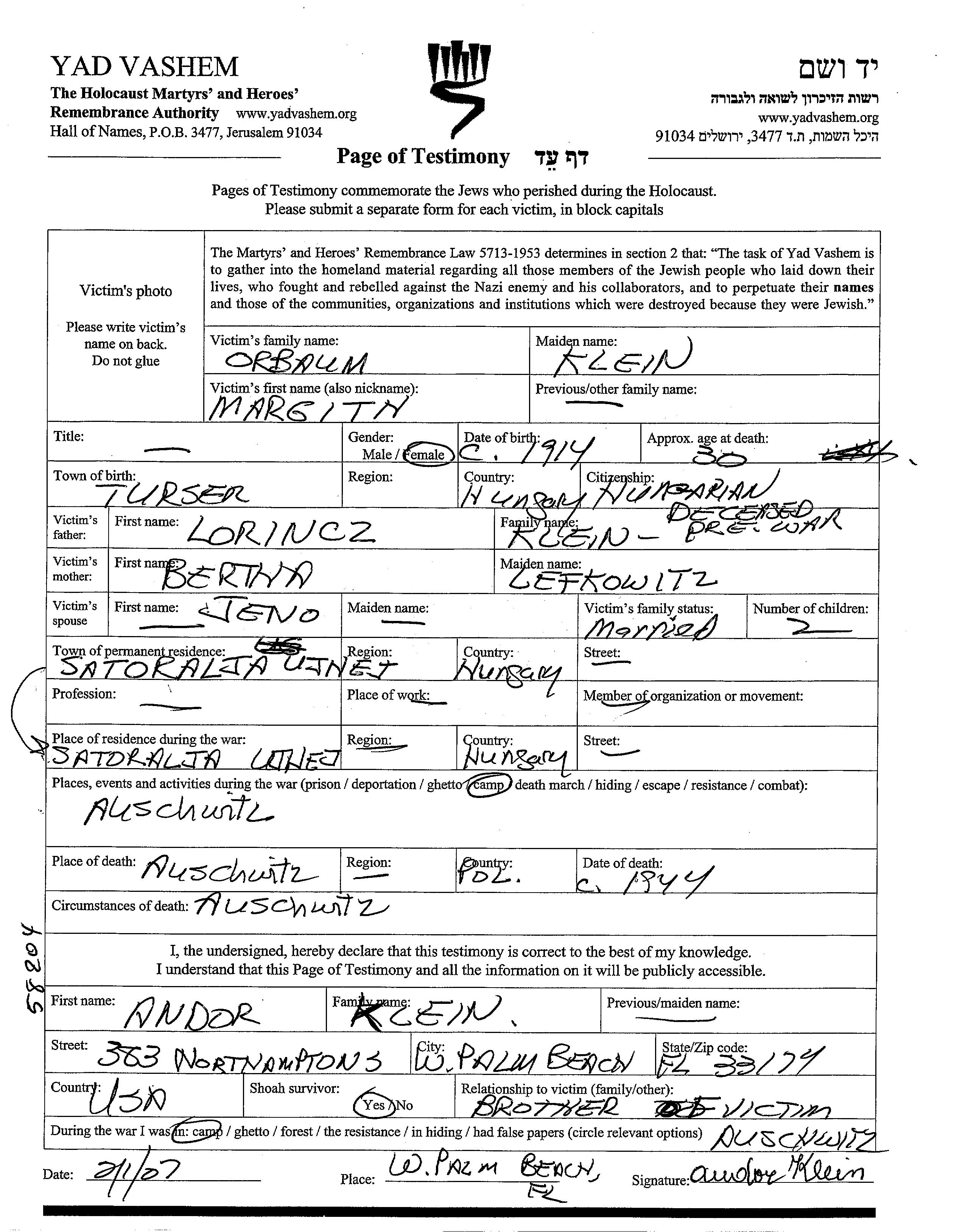 Margith Orbaum, geb. Klein wurde im Jahr 1914 in Turricse, Ungarn geboren. Sie war die Tochter von Lorincz und Bertha, geb. Lefkowitz. Sie war mit Jeno Verheiratet. Vor dem Zweiten Weltkrieg lebte sie in Satoraljaujhej, Ungarn. Während des Krieges war sie in Satoraljaujhej, Ungarn.