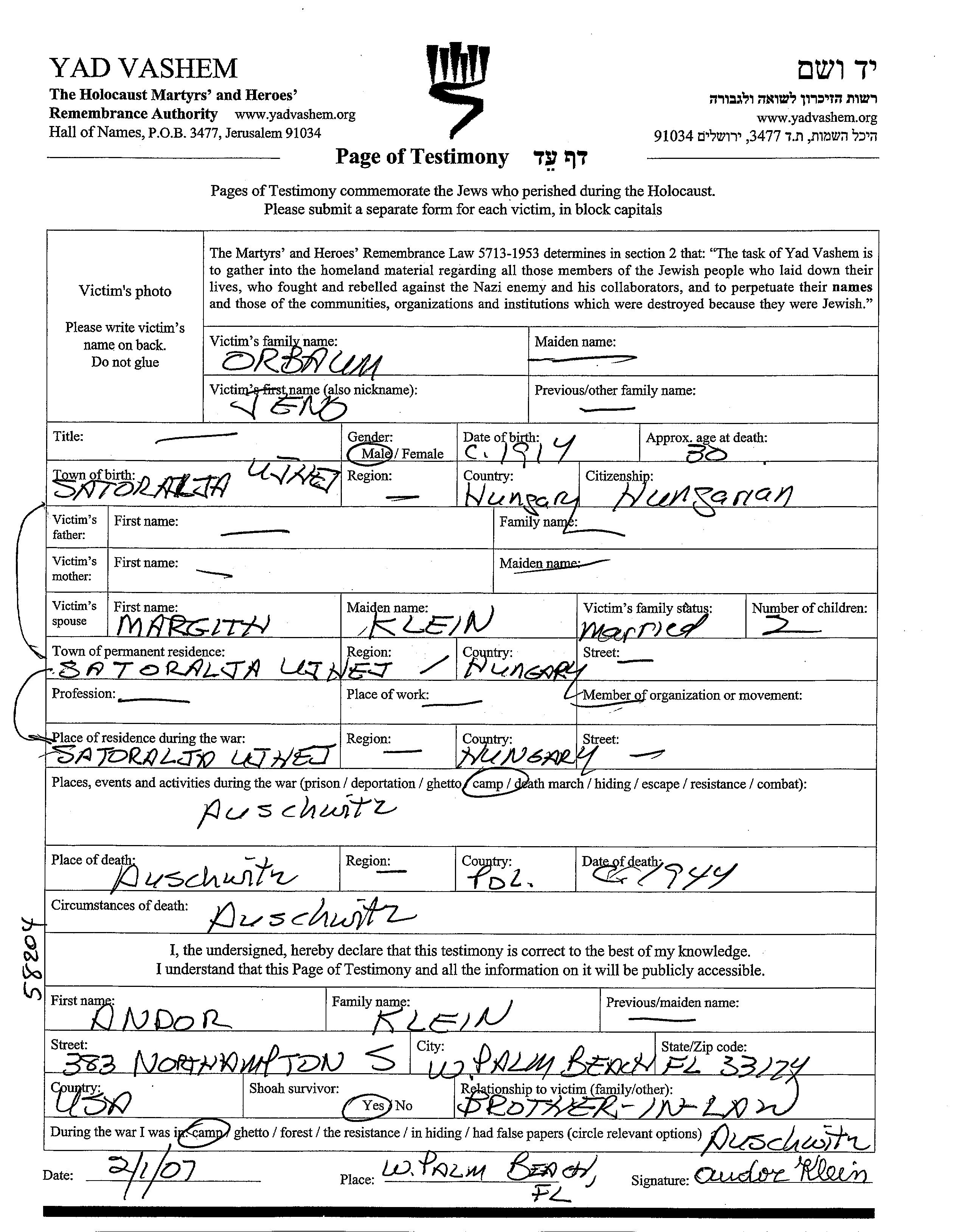 Jeno Orbaum wurde im Jahr 1914 in Satoraljaujhej, Ungarn geboren. Er war mit Margith, geb. Klein Verheiratet. Vor dem Zweiten Weltkrieg lebte er in Satoraljaujhej, Ungarn. Während des Krieges war er in Satoraljaujhej, Ungarn.
