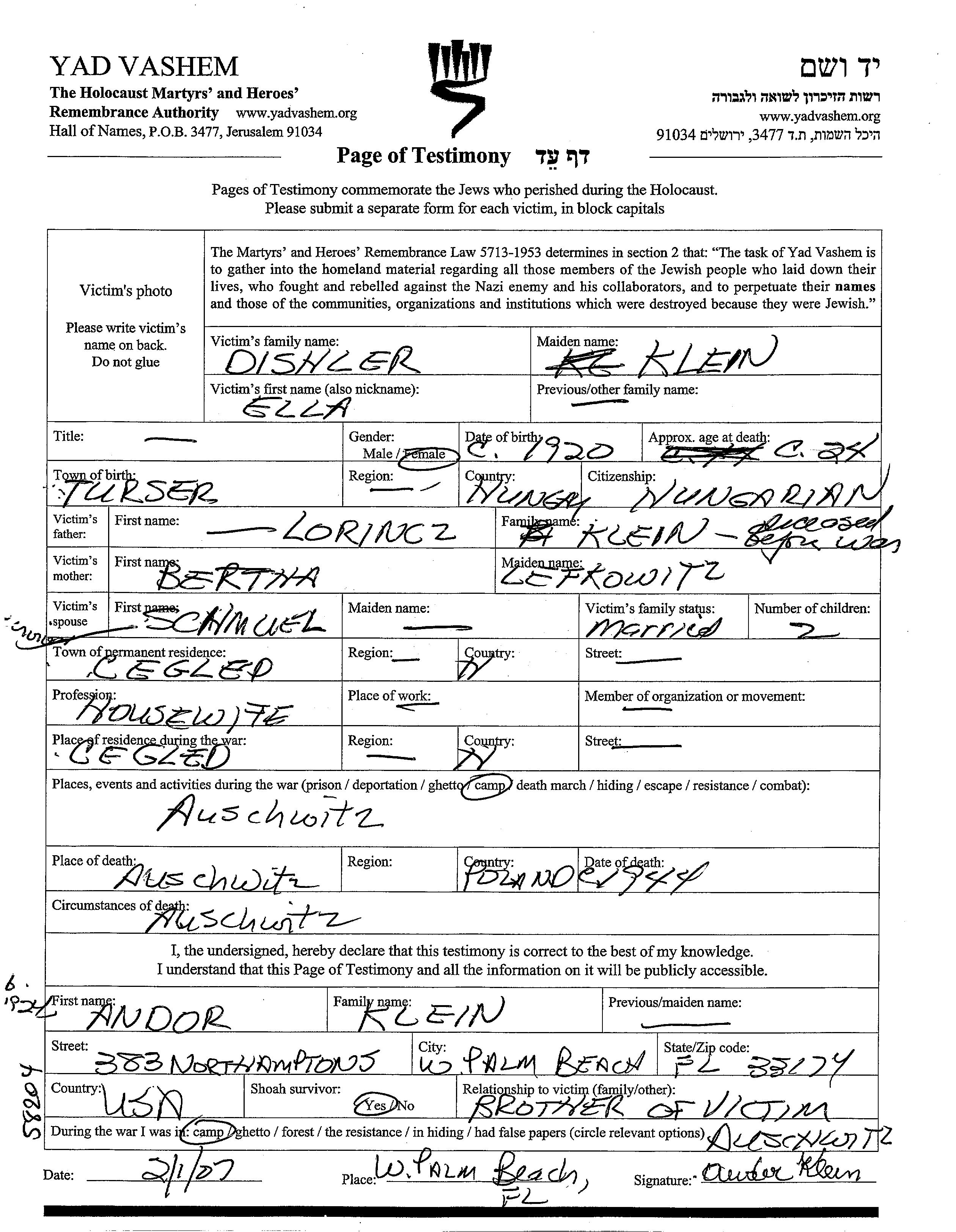 Ella Dishler, geb. Klein wurde im Jahr 1920 in Turricse, Ungarn geboren. Sie war die Tochter von Lorincz und Bertha, geb. Lefkowitz. Sie war Hausfrau und mit Schmuel Verheiratet. Vor dem Zweiten Weltkrieg lebte sie in Cegled, Ungarn. Während des Krieges war sie in Cegled, Ungarn.