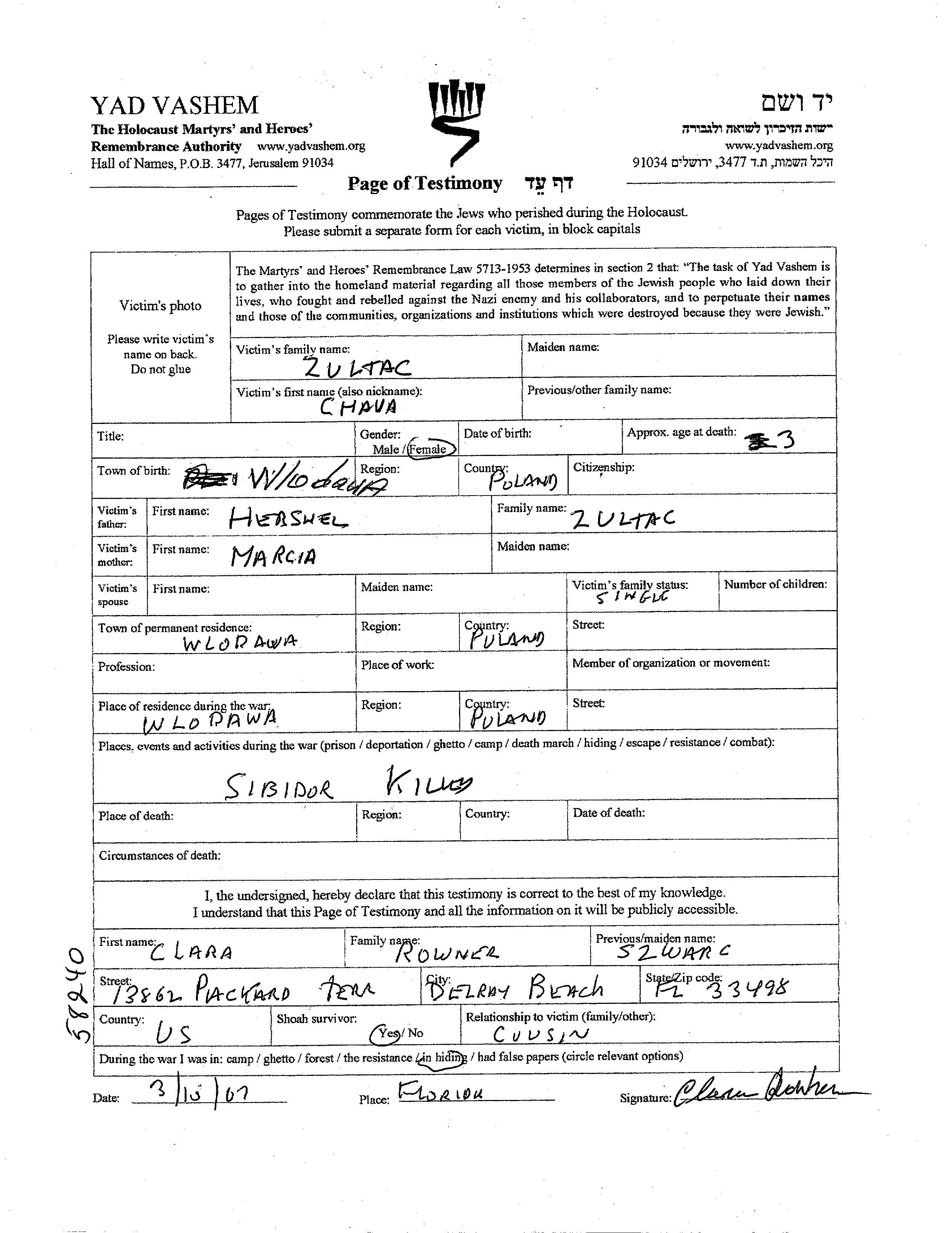 Zultac Chava Wlodawa, Polen Gedenkblatt